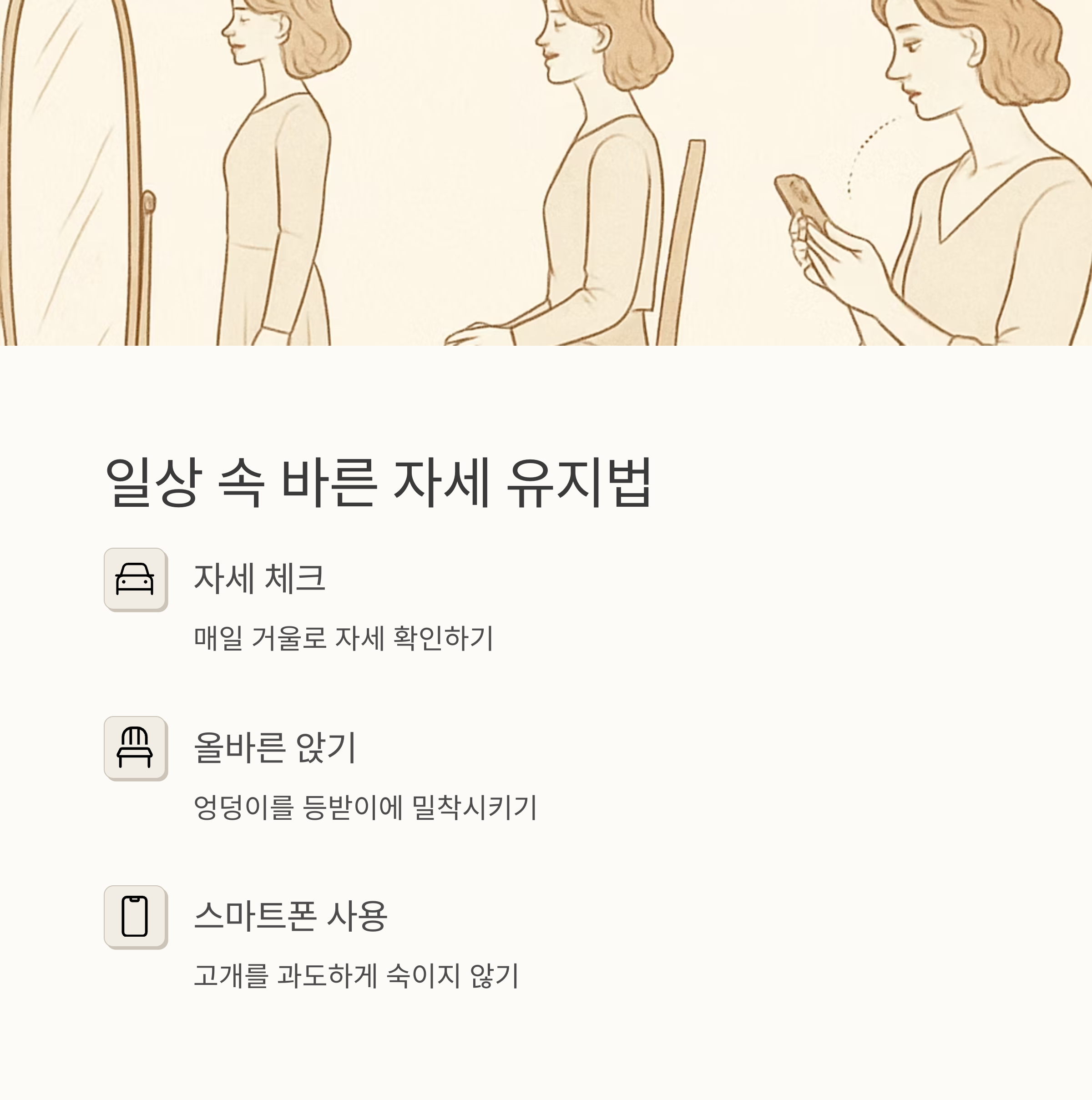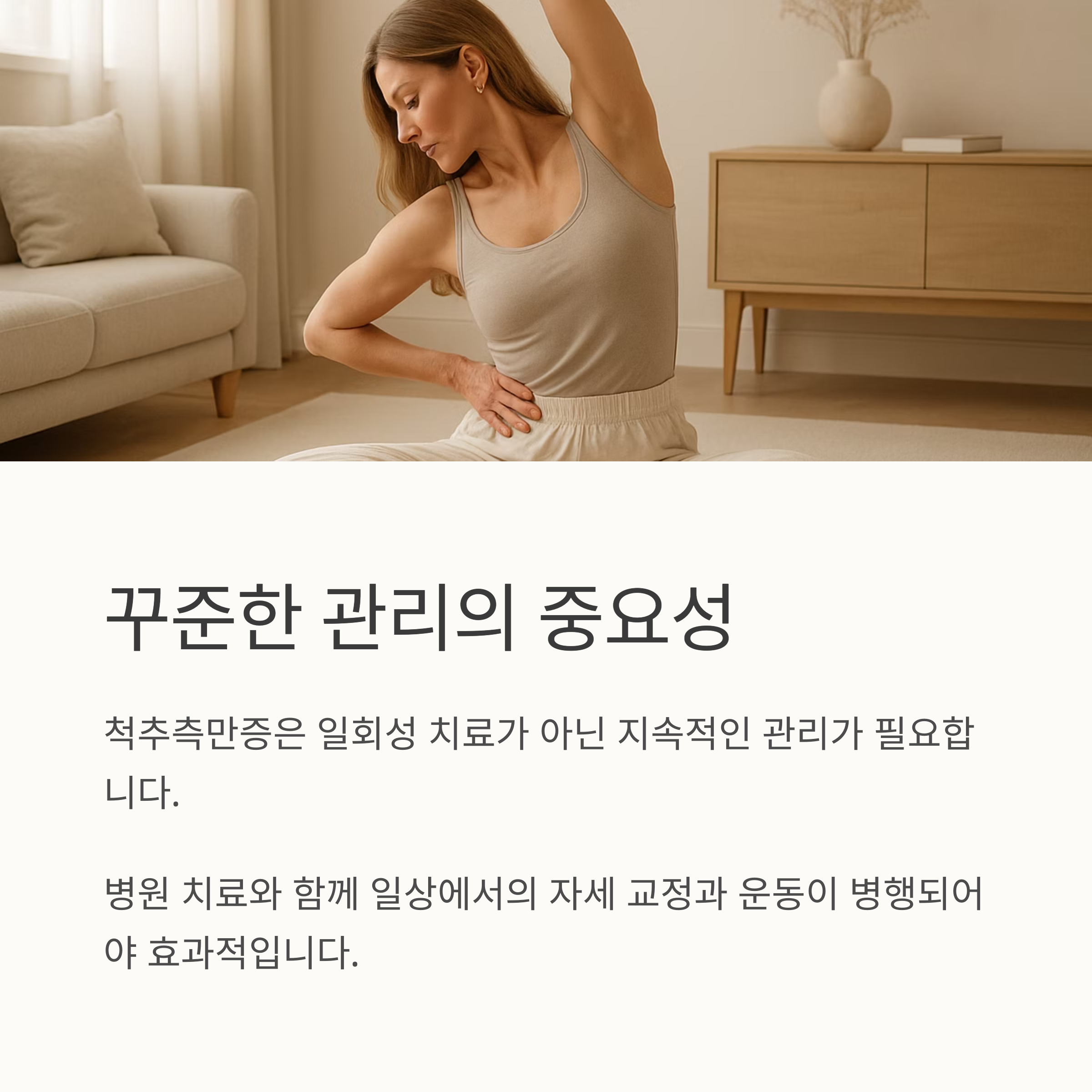 척추측만증 관리의 핵심은 바른 자세와 꾸준한 운동입니다. 매일 거울을 보며 자세를 체크하고, 의자에 앉을 때는 엉덩이를 등받이에 밀착시키는 습관을 들여야 해요. 그리고 스마트폰을 사용할 때 고개를 숙이지 않도록 주의하고, 잠잘 때도 너무 높은 베개는 피하는 것이 좋답니다.