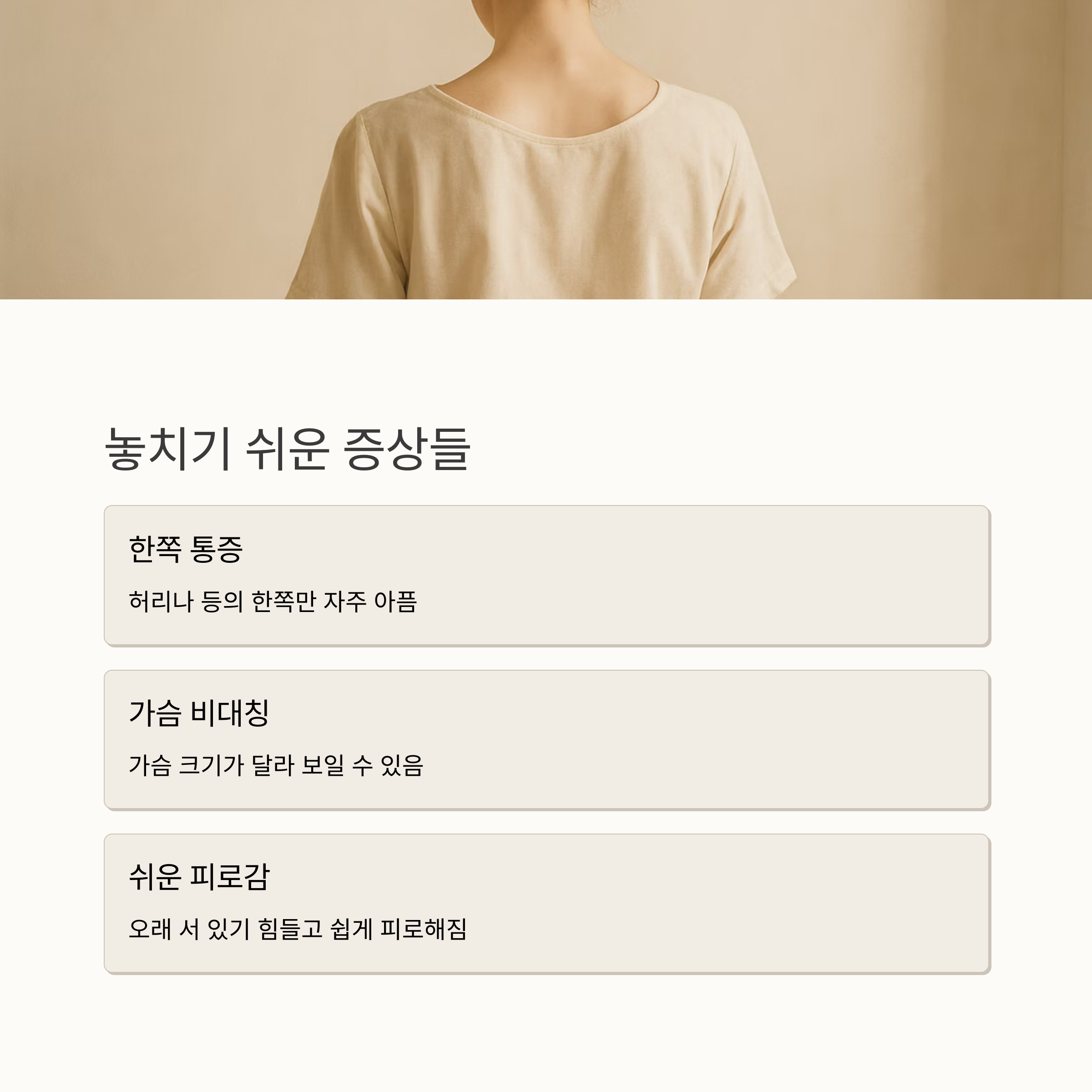 척추측만증은 단순히 척추만 휘는 것이 아니라, 우리 몸 전체에 영향을 미쳐요. 어깨 높이가 다르거나, 골반이 기울어져 보이는 것은 물론이고요. 허리나 등에 한쪽만 통증이 자주 느껴진다면 의심해봐야 해요. 심하면 등의 중심선이 휘어 보이기도 하고, 심지어 가슴 크기까지 달라 보일 수 있다고 하니 놀랍죠? 만약 쉽게 피로해지고, 오래 서 있기 힘들다면 척추측만증을 의심해볼 만한 증상입니다.