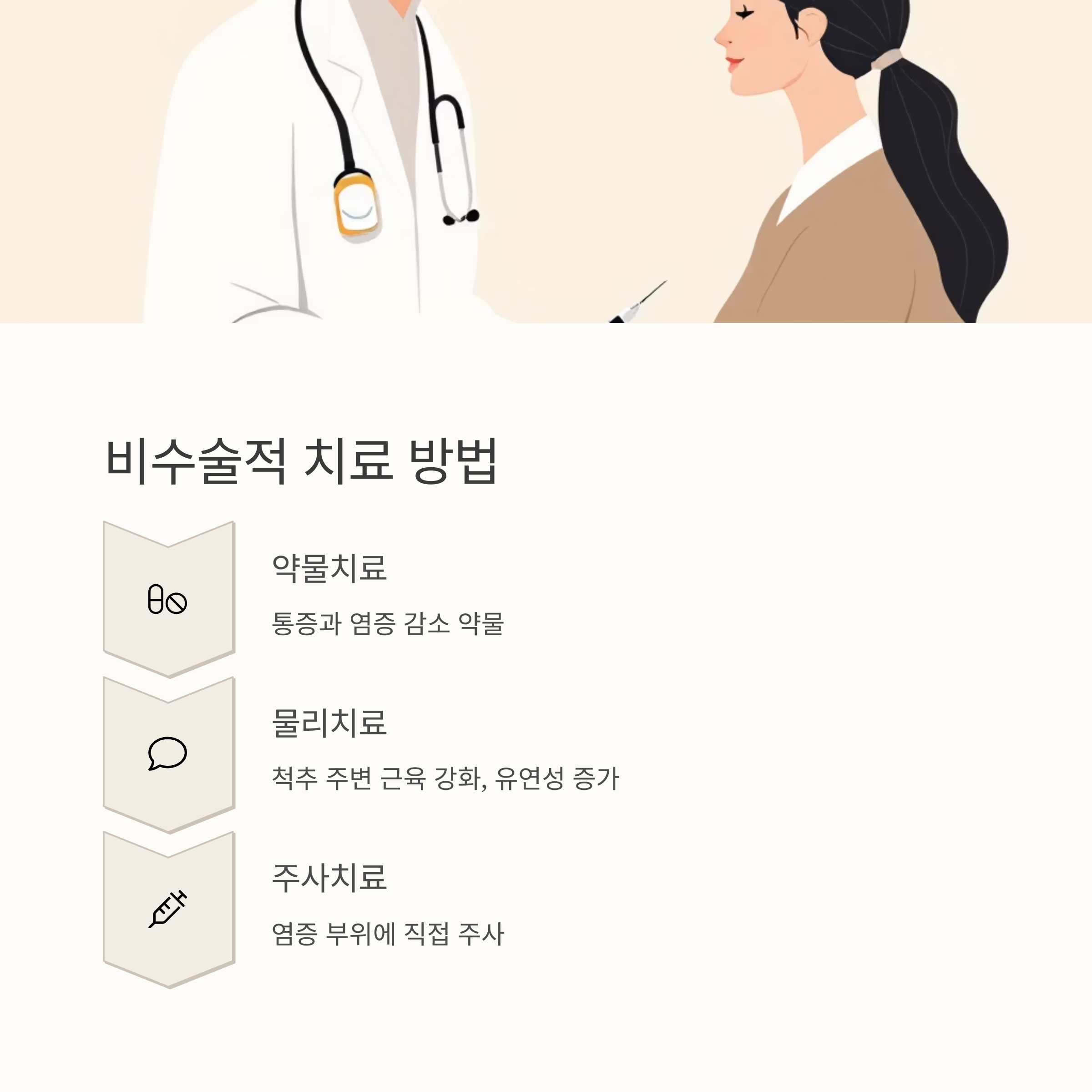 약물치료는 통증과 염증을 줄여주는 약을 먹거나 주사로 맞는 방법입니다. 물리치료는 척추 주변 근육을 강화하고 유연성을 높여 통증을 완화시켜주죠. 주사치료는 염증이 심한 부위에 직접 주사하는 방법으로, 통증을 빠르게 줄이는 데 효과적입니다.