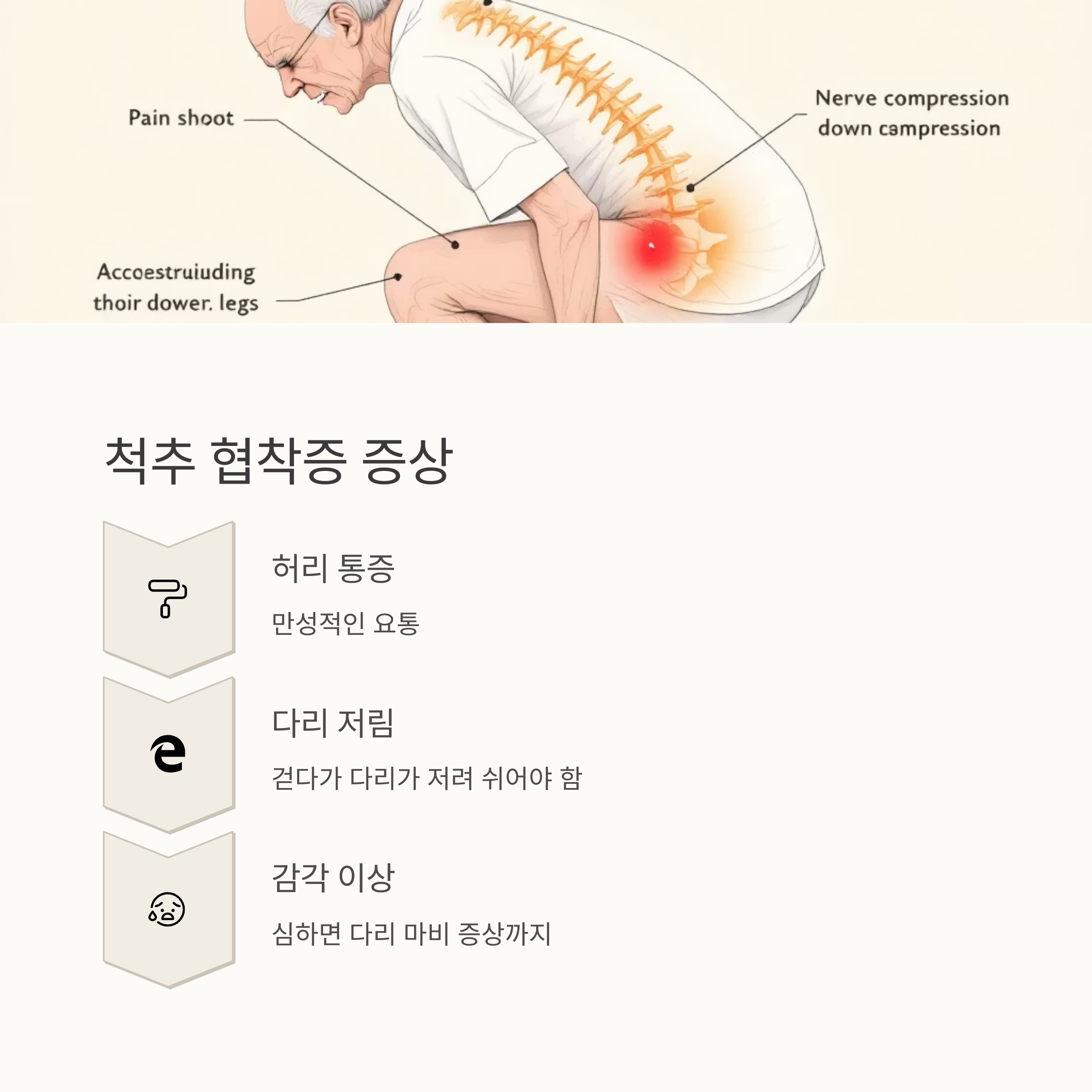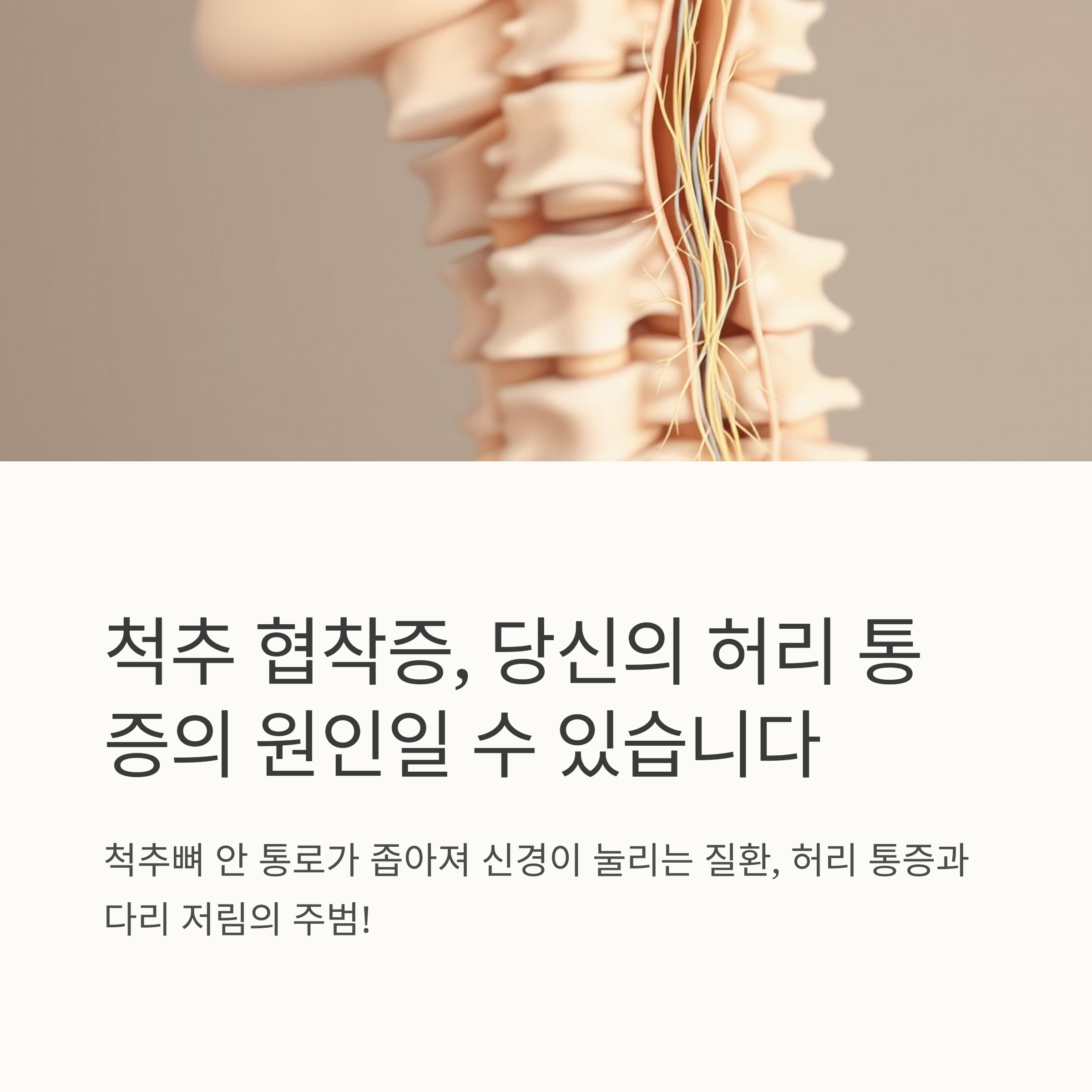 척추 협착증… 이름부터 어렵죠? 쉽게 말해 척추뼈 안 통로가 좁아져 신경이 눌리는 질환이에요. 나이가 들면서 척추뼈가 닳거나, 디스크가 삐져나오면서 생기는 경우가 많아요. 꽉 막힌 고속도로처럼 신경이 제대로 움직이지 못하는 거죠. 그러니 허리 통증은 기본이고, 다리 저림, 심하면 감각 이상까지 생길 수 있어요.