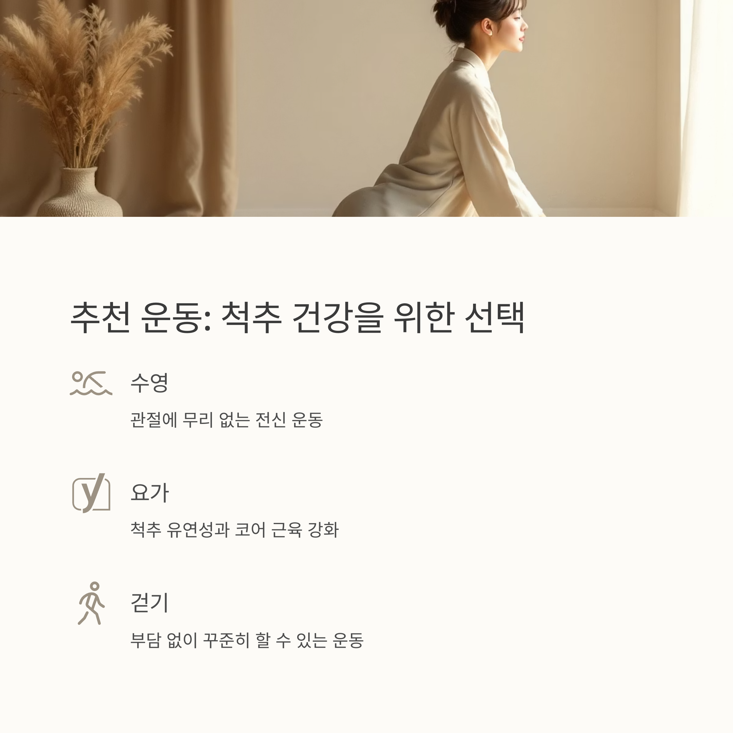 저는 수영과 요가를 추천해요. 수영은 관절에 무리가 가지 않으면서 전신 운동이 되고, 요가는 척추를 유연하게 해주고 코어 근육을 강화하는 데 도움이 돼요. 물론 본인에게 맞는 운동을 선택하는 것이 중요해요. 무리하지 않는 선에서 꾸준히 하는 게 중요해요.