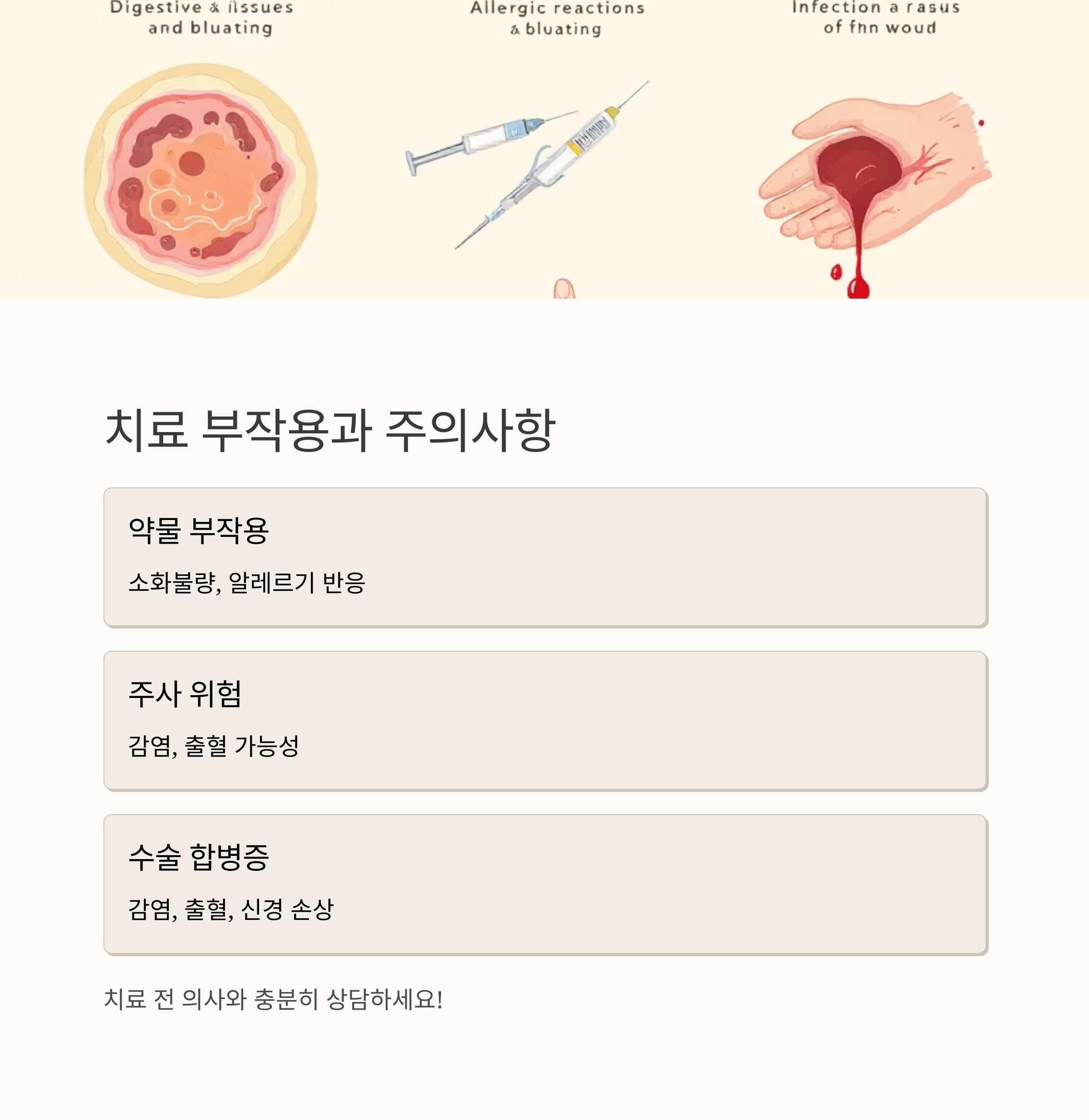 수술 후 감염, 출혈, 신경 손상 등 심각한 합병증이 발생할 수 있으니 신중하게 결정해야 해요. 따라서, 치료 전에 의사와 충분히 상담하여 자신에게 가장 적합한 치료 방법을 선택하는 것이 중요해요.