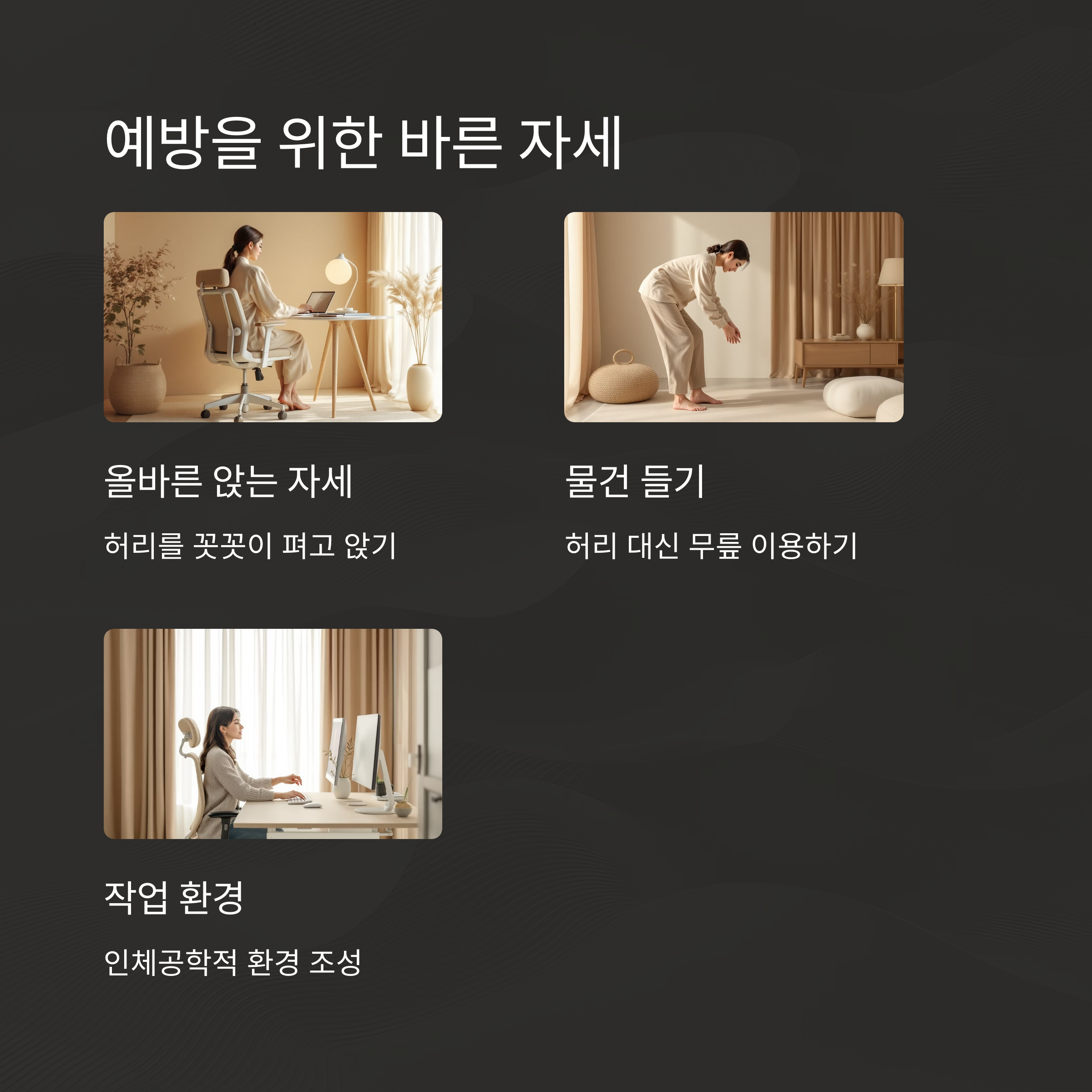 척추 협착증 예방과 관리를 위해서는 일상생활에서의 노력이 정말 중요해요! 가장 중요한 건 바른 자세를 유지하는 거예요. 의자에 앉을 때도 허리를 꼿꼿이 펴고, 무거운 물건을 들 때는 허리를 굽히지 않고 무릎을 이용해야 해요. 그리고 꾸준한 운동도 필수예요!