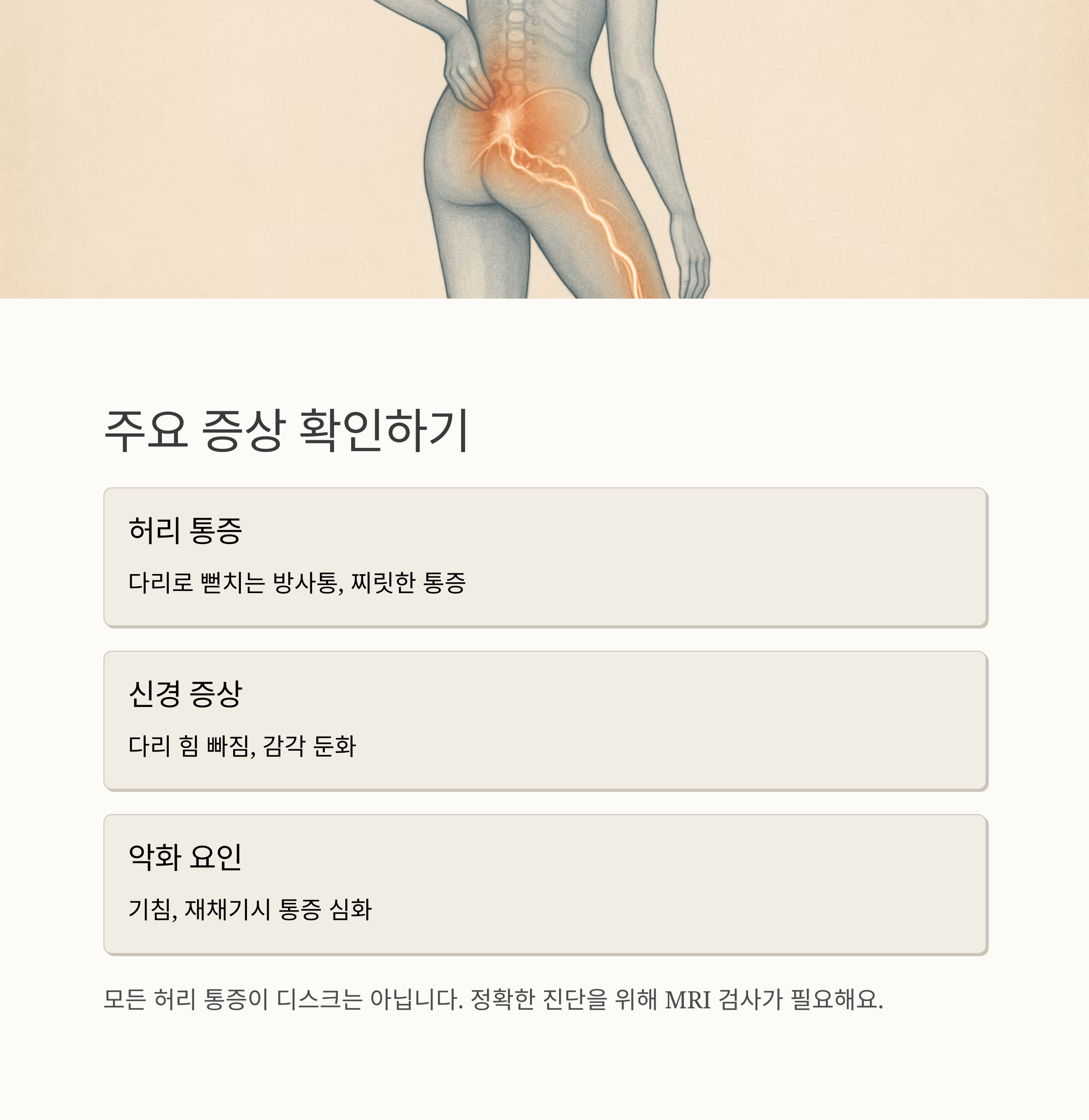 추간판 탈출증은 단순히 허리만 아픈 것이 아니에요. 다양한 증상들이 나타날 수 있는데요, 가장 흔한 증상은 허리 통증과 함께 다리로 뻗치는 방사통입니다. 마치 전기가 흐르는 듯한, 찌릿찌릿한 통증을 느낄 수도 있고요. 심한 경우에는 다리에 힘이 빠지거나 감각이 둔해지는 등의 신경학적 증상이 나타나기도 합니다.
