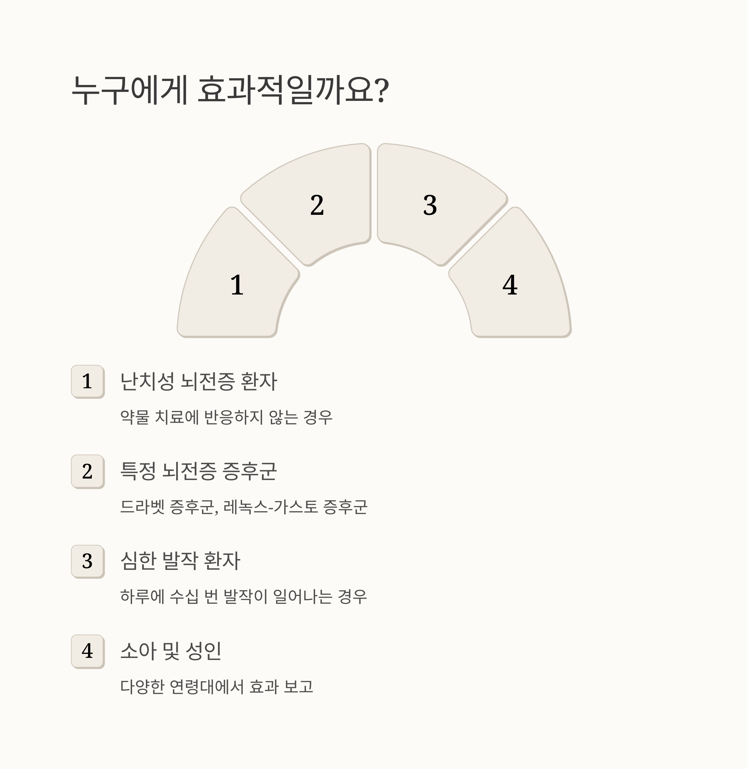 케톤 식이요법은 모든 뇌전증 환자에게 적용되는 것은 아닙니다. 특히 약물 치료에 반응하지 않는 난치성 뇌전증 환자, 드라벳 증후군이나 레녹스-가스토 증후군과 같은 특정 뇌전증 환자에게 효과적일 수 있습니다. 하루에도 수십 번씩 발작이 일어나는 심한 경우에도 시도해 볼 수 있지만, 전문가의 판단이 가장 중요합니다. 케톤 식이요법은 모든 문제에 대한 만능 해결책이 아니라는 점을 기억해야 합니다.