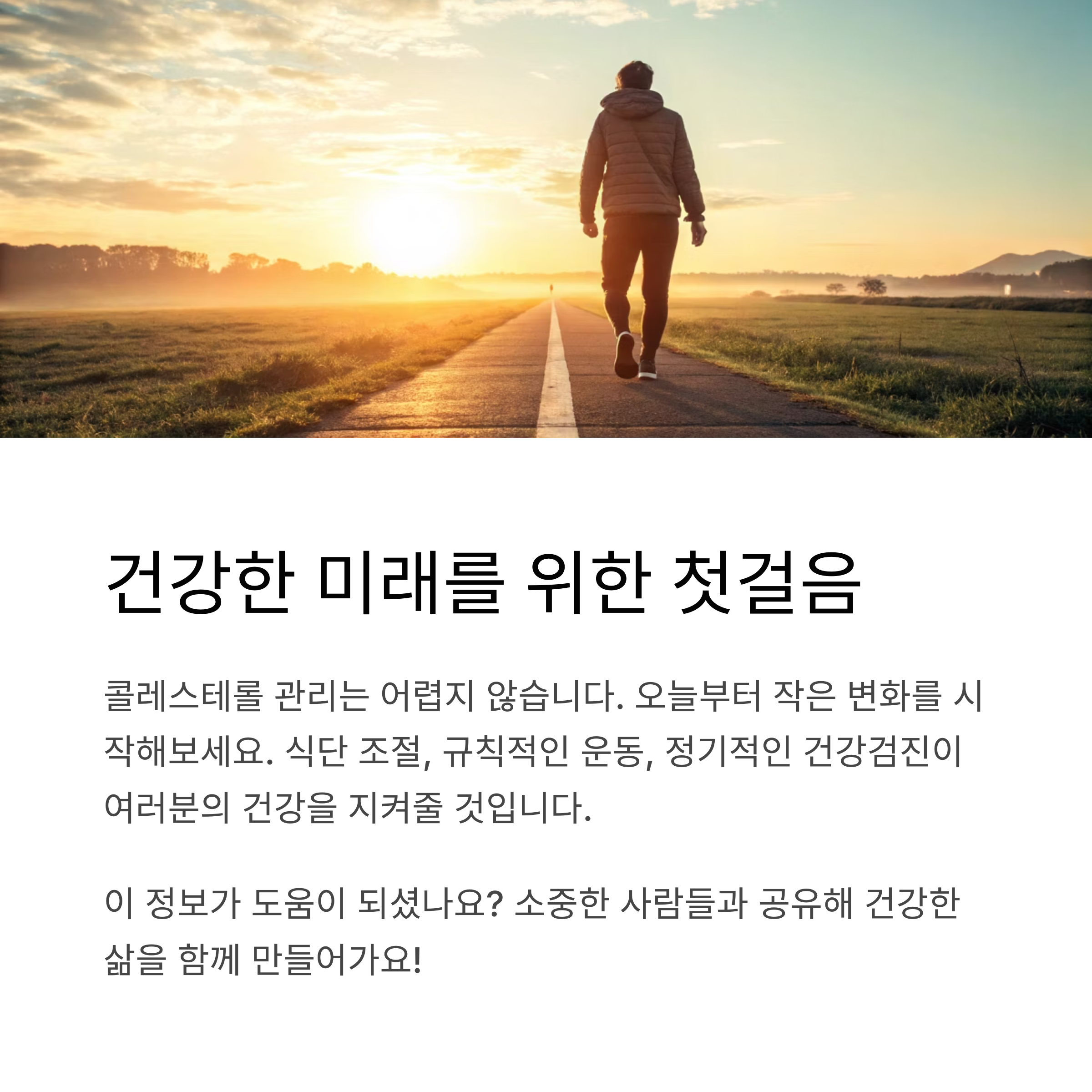 콜레스테롤 수치 관리, 어렵게 느껴지셨나요? 하지만 꾸준한 노력으로 충분히 건강하게 관리할 수 있습니다. 오늘부터 작은 변화를 실천해 보세요. 식단 조절, 규칙적인 운동, 그리고 정기적인 건강검진이 여러분의 건강을 지켜줄 거예요. 건강한 삶은 멀리 있지 않습니다. 함께 건강한 미래를 만들어 나가요!