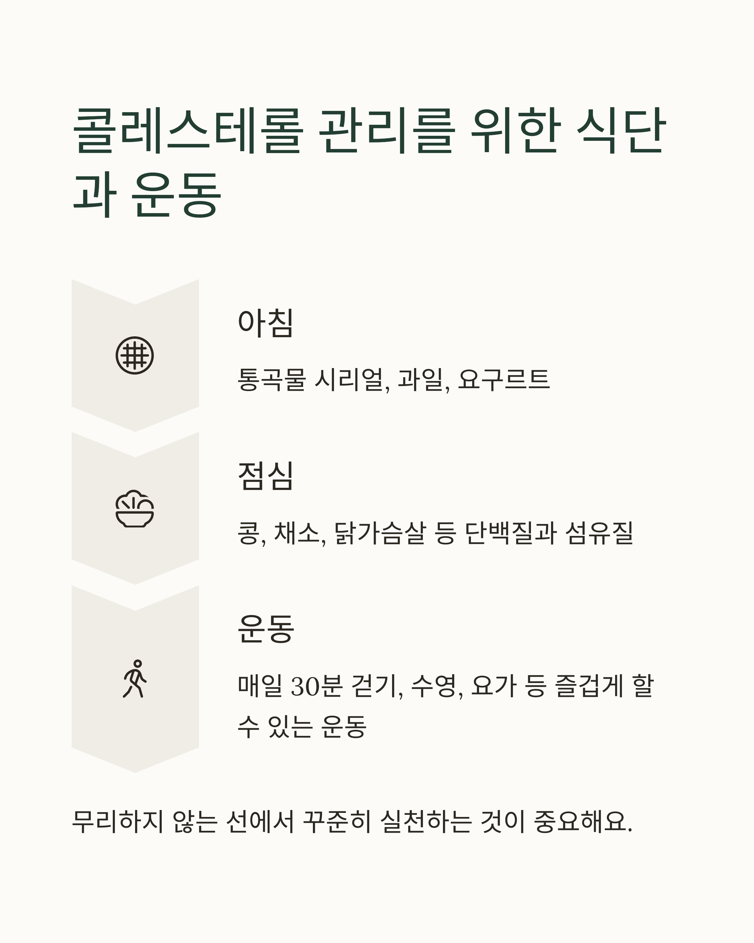 구체적인 식단과 운동 계획을 세워볼까요? 아침에는 귀리나 현미 등 통곡물 시리얼과 과일, 요구르트를 먹는 게 좋아요. 점심은 콩, 채소, 닭가슴살 등 단백질과 섬유질이 풍부한 음식을 중심으로 먹고, 저녁은 가볍게 먹는 게 좋겠죠. 그리고 튀긴 음식이나 기름진 음식은 피하고, 신선한 채소와 과일을 많이 섭취하는 게 중요해요.
