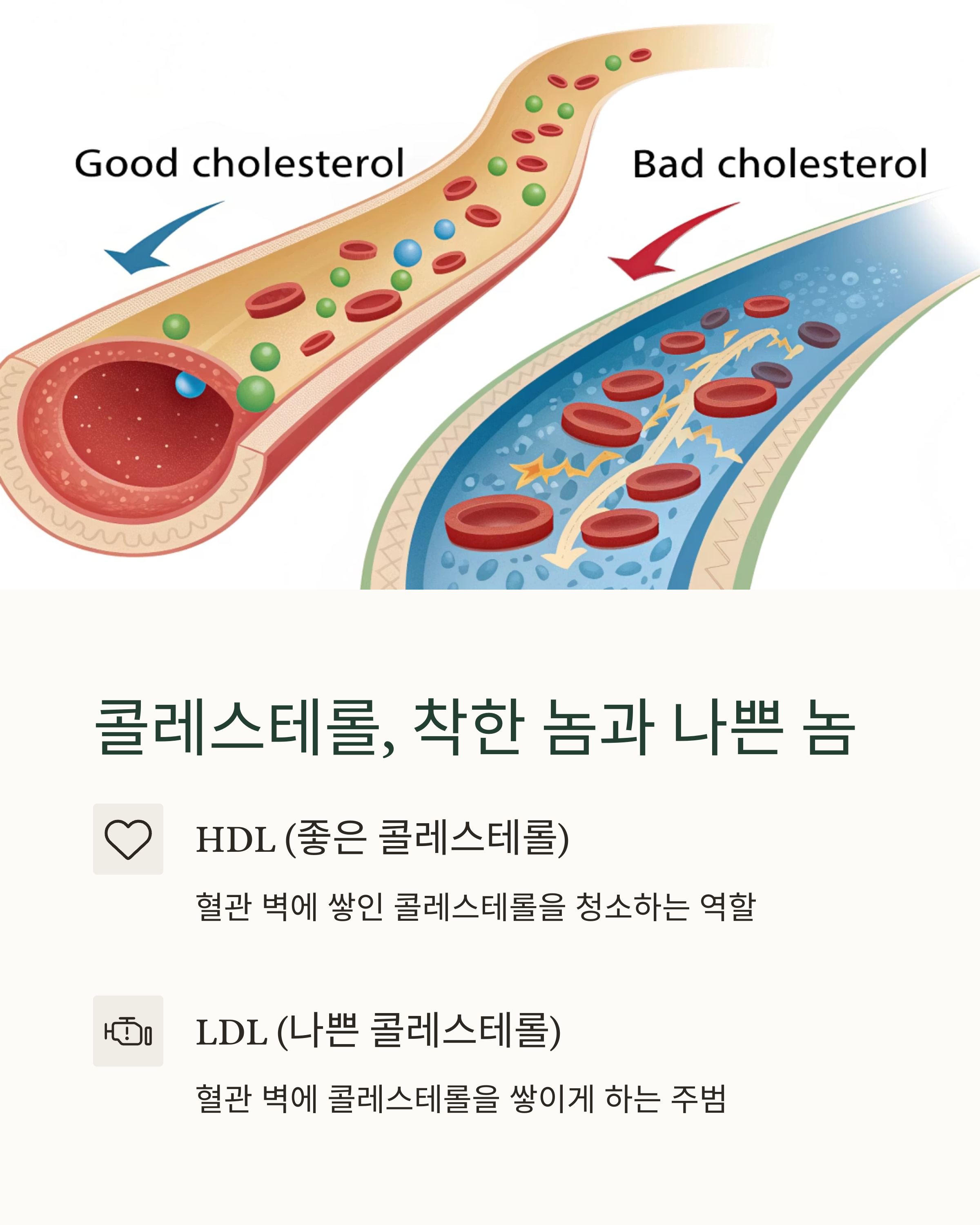 콜레스테롤 하면 왠지 나쁜 거 같지만, 사실 우리 몸에 꼭 필요한 물질이에요. 세포막을 구성하고, 호르몬을 만드는 데 중요한 역할을 하거든요. 문제는 콜레스테롤이 혈액 속에 너무 많아지면서 생기는데, 콜레스테롤은 크게 두 종류로 나뉘어요. HDL, 흔히 ‘좋은 콜레스테롤’이라고 불리는 고밀도 지단백은 혈관 벽에 쌓인 콜레스테롤을 깨끗하게 청소하는 역할을 해요. 반대로 LDL, ‘나쁜 콜레스테롤’이라고 불리는 저밀도 지단백은 혈관 벽에 콜레스테롤을 쌓이게 하는 주범이에요.