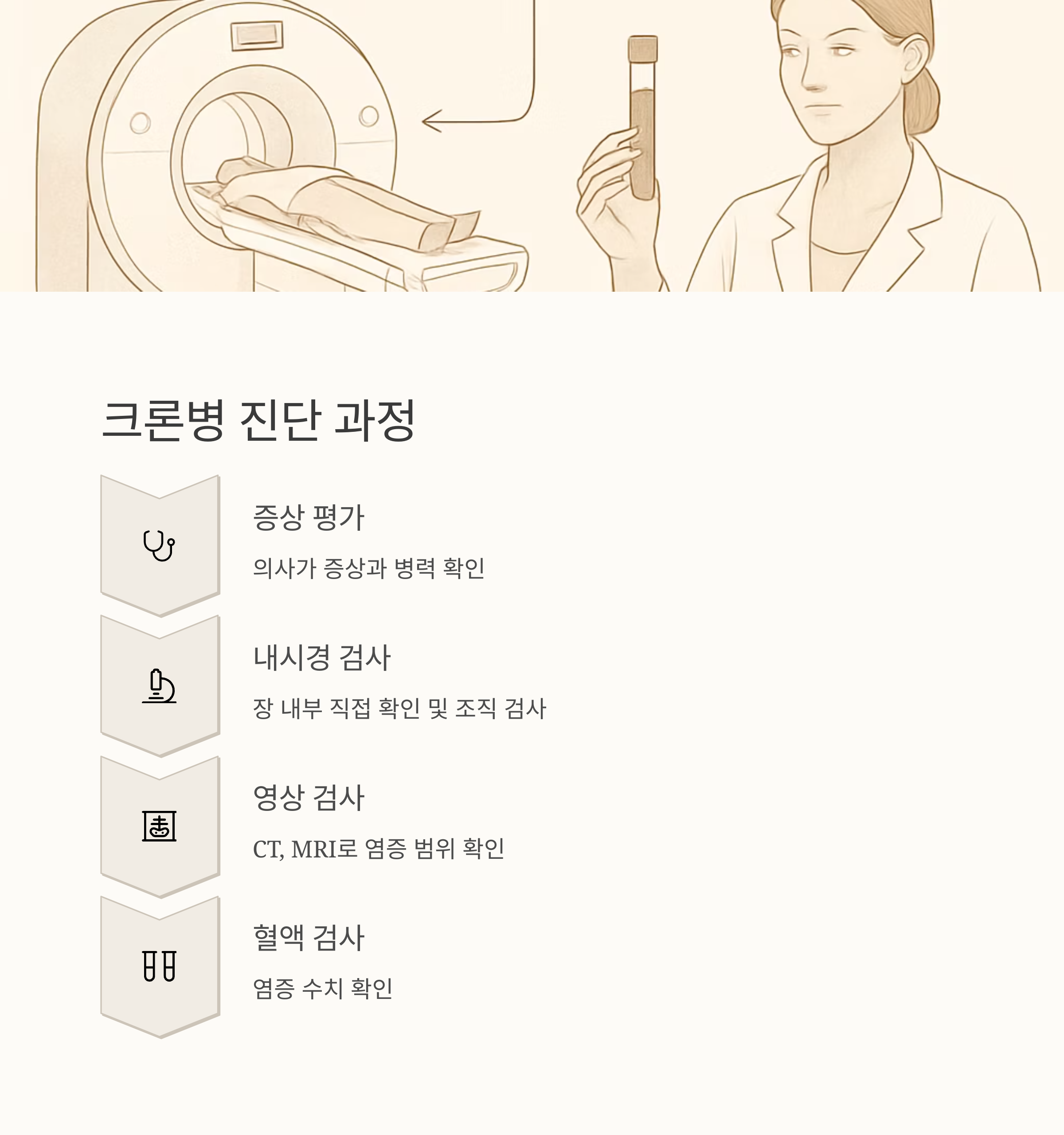 크론병을 진단하려면 여러 가지 검사를 해야 해요. 먼저 의사 선생님이 증상과 병력을 자세하게 듣고, 크론병일 가능성이 있다고 판단하면 내시경 검사를 하게 돼요. 내시경 검사는 장 안쪽을 직접 확인할 수 있는 아주 중요한 검사인데, 여기서 염증이 있는 부위를 찾아낼 수 있답니다.