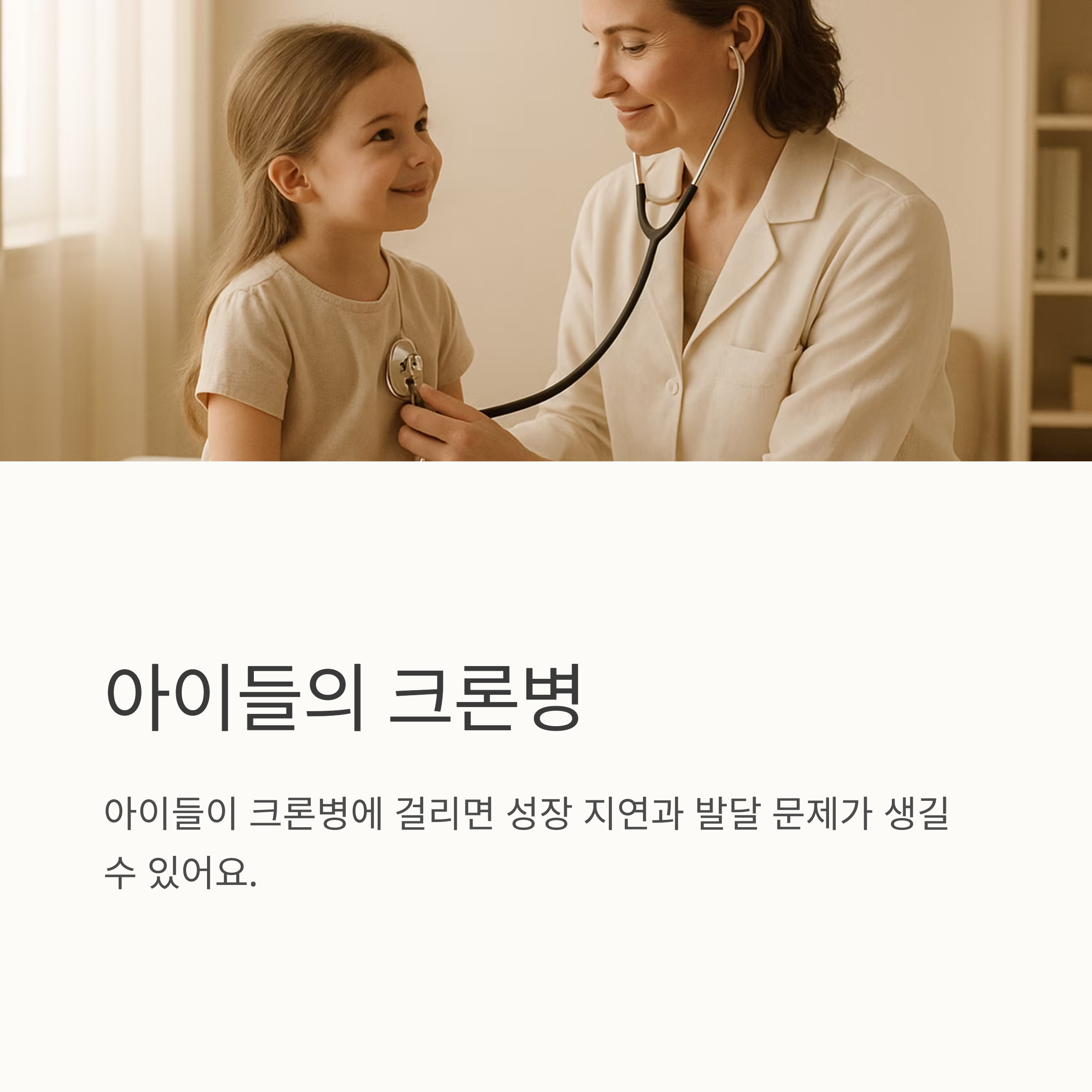 심한 경우에는 변에 피가 섞여 나오거나 항문 주변이 아프고, 농양이 생기기도 해요. 아이들이 크론병에 걸리면 성장이 더뎌지거나 발달에 문제가 생길 수도 있기 때문에 더욱더 주의해야 해요. 증상은 심해졌다가 나아졌다가를 반복하는데, 이런 재발 때문에 육체적으로나 정신적으로 큰 부담을 느끼게 된답니다.