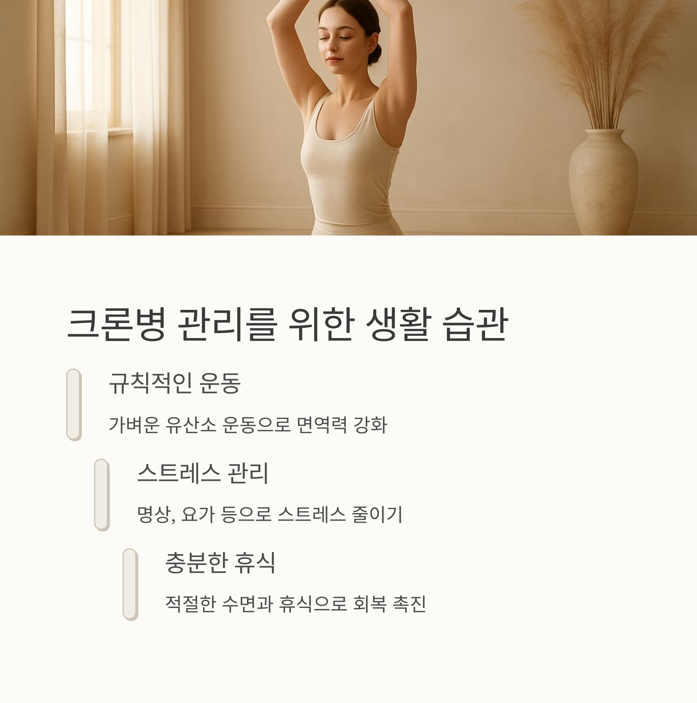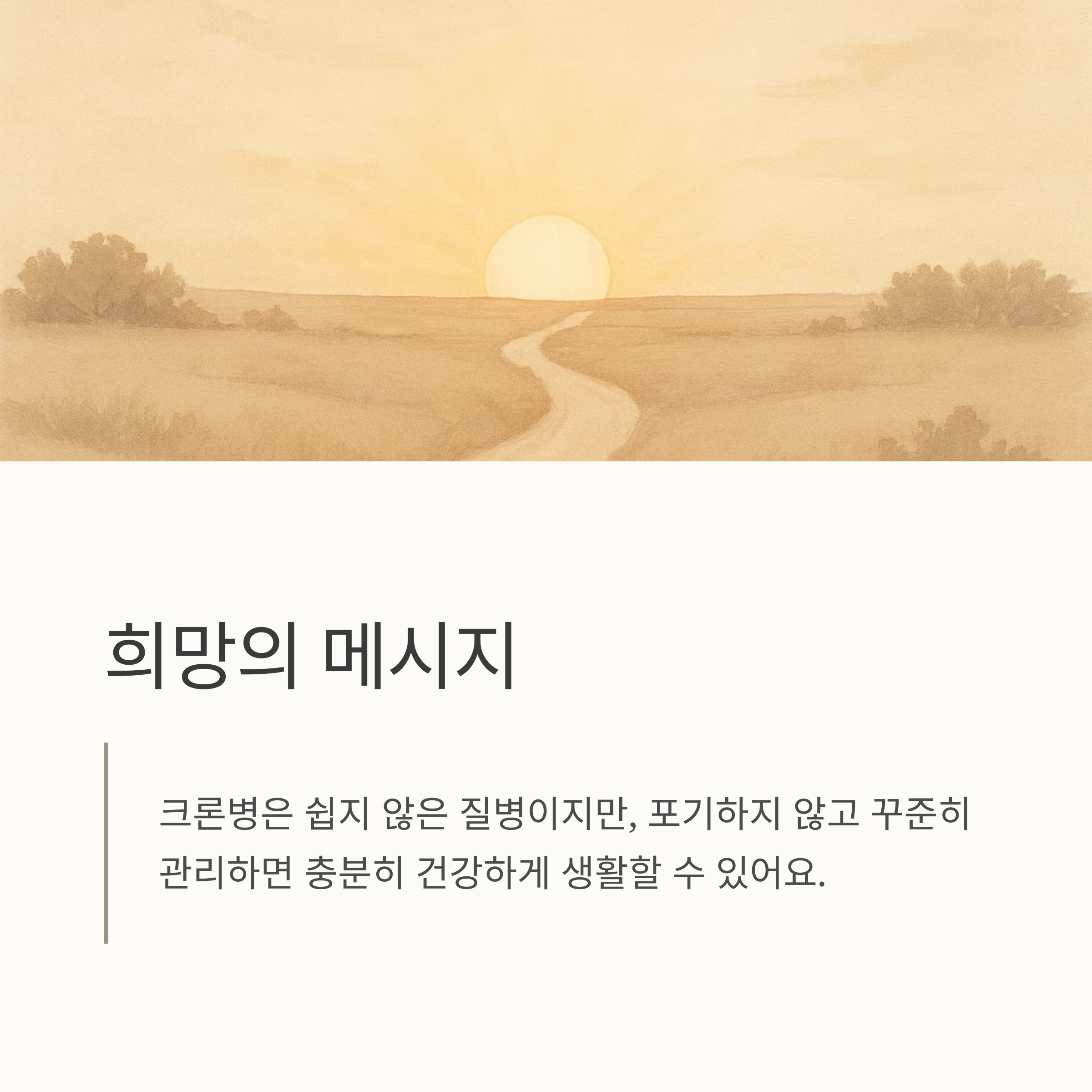 크론병은 쉽지 않은 질병이지만, 포기하지 않고 꾸준히 관리하면 충분히 건강하게 생활할 수 있어요. 자신에게 맞는 식단을 찾고, 스트레스 관리를 잘하고, 규칙적인 운동과 충분한 휴식을 취하는 것이 중요해요. 그리고 무엇보다 전문의와 꾸준히 소통하며 치료 계획을 잘 지키는 것이 크론병 관리의 핵심이랍니다. 힘든 시간 속에서도 희망을 잃지 않고, 건강한 삶을 향해 나아가시길 바랍니다!