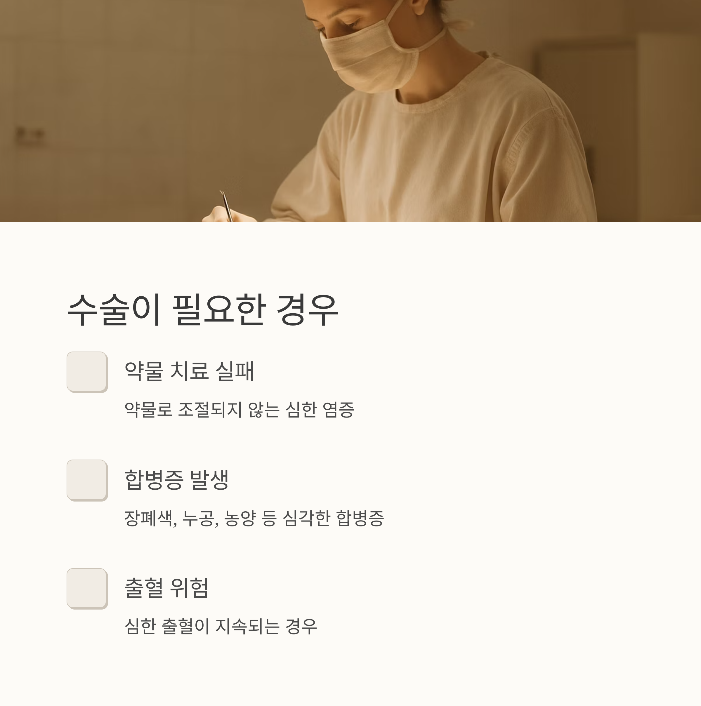 최근에는 생물학적 제제, 특히 종양괴사인자 차단제 같은 특수 약물이 많이 사용되고 있지만, 가격이 비싸고 부작용 관리가 중요하다는 점을 명심해야 해요. 약물 치료에도 효과가 없거나 합병증이 심각하면 수술이 필요할 수도 있어요.