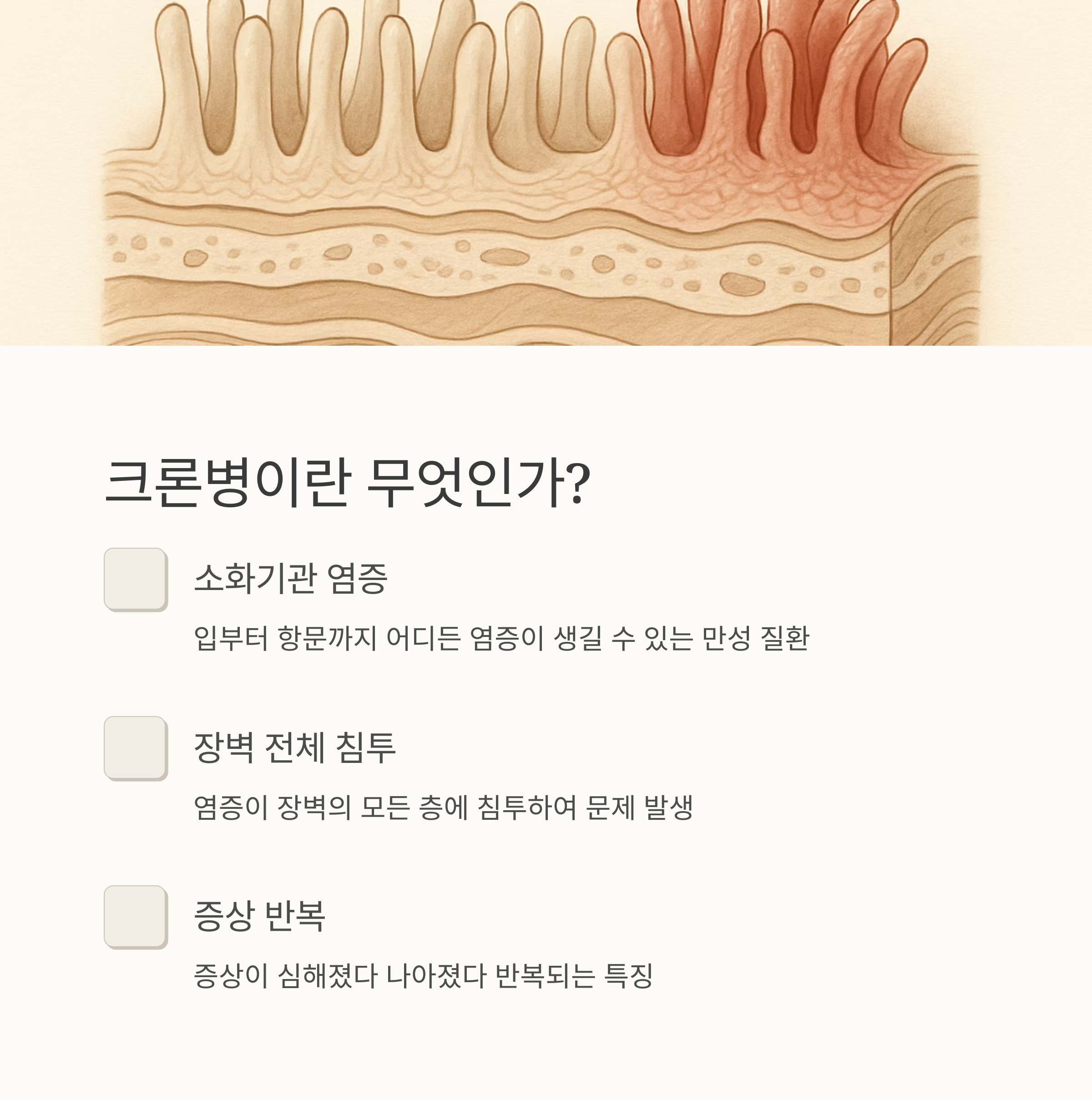 크론병, 이름부터 생소하시죠? 크론병은 우리 몸의 소화기관, 입부터 항문까지 어디든 염증이 생길 수 있는 만성 질환이에요. 마치 소화기관에 불이 난 것처럼 염증이 장벽 전체를 덮치는 거죠. 소장과 대장에 주로 생기지만, 어디든 염증이 나타날 수 있어서 참 까다로운 질환이에요.