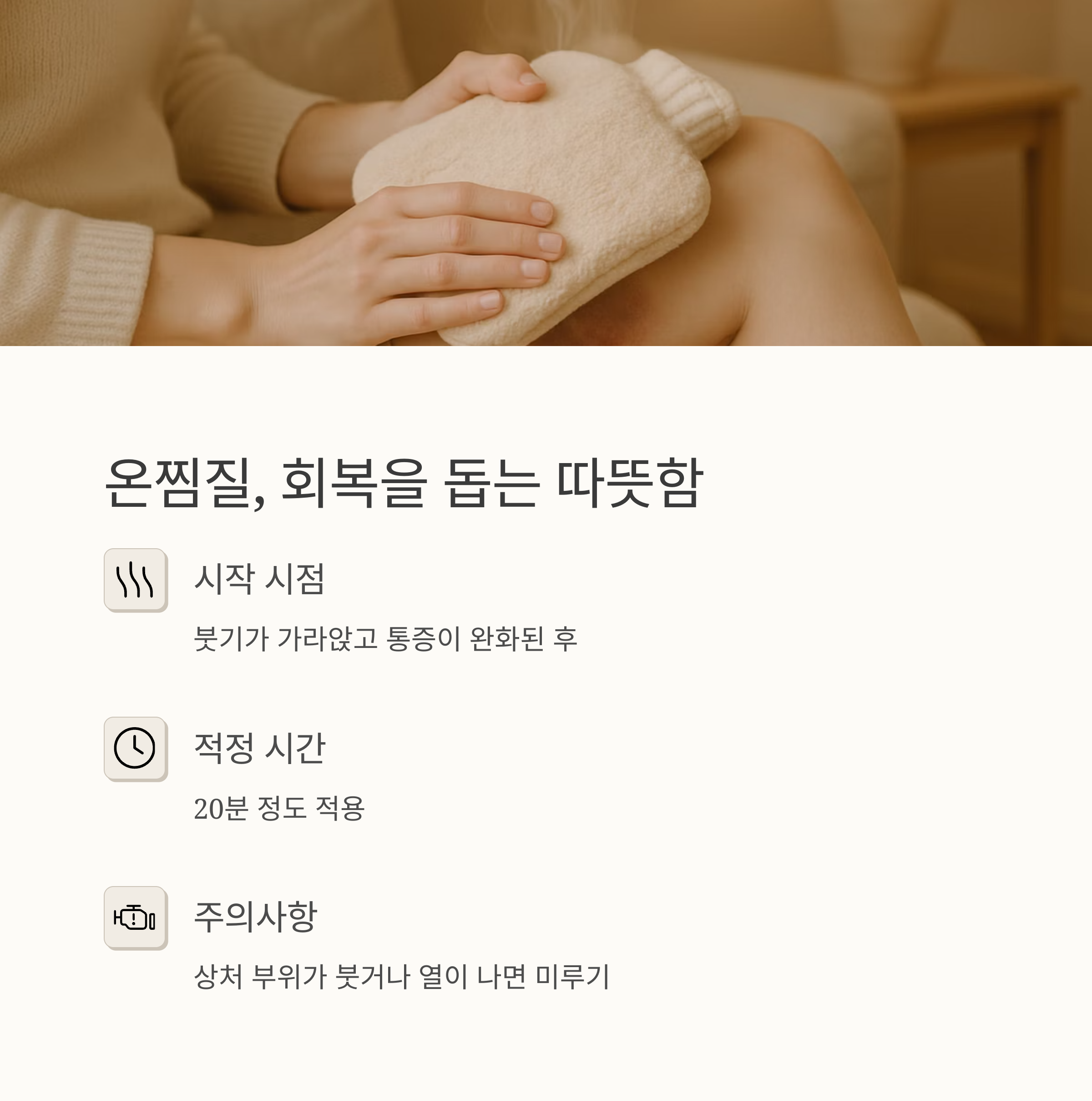 붓기가 어느 정도 가라앉고 통증이 완화되면 온찜질을 시작해도 괜찮아요. 따뜻한 물로 찜질을 하거나 따뜻한 찜질팩을 사용하면 혈액순환이 촉진돼서 손상된 조직의 회복을 돕거든요. 온찜질은 20분 정도 하는 것이 적당하고, 너무 뜨겁지 않은 온도로 해주는 게 포인트예요. 저는 개인적으로 온찜질을 할 때 따뜻한 물에 천을 적셔서 찜질하는 걸 선호하는데, 촉촉하고 따뜻한 느낌이 꽤 좋아요. 하지만 상처 부위가 아직 붓거나 열이 나면 온찜질은 잠시 미루는 게 좋아요!
