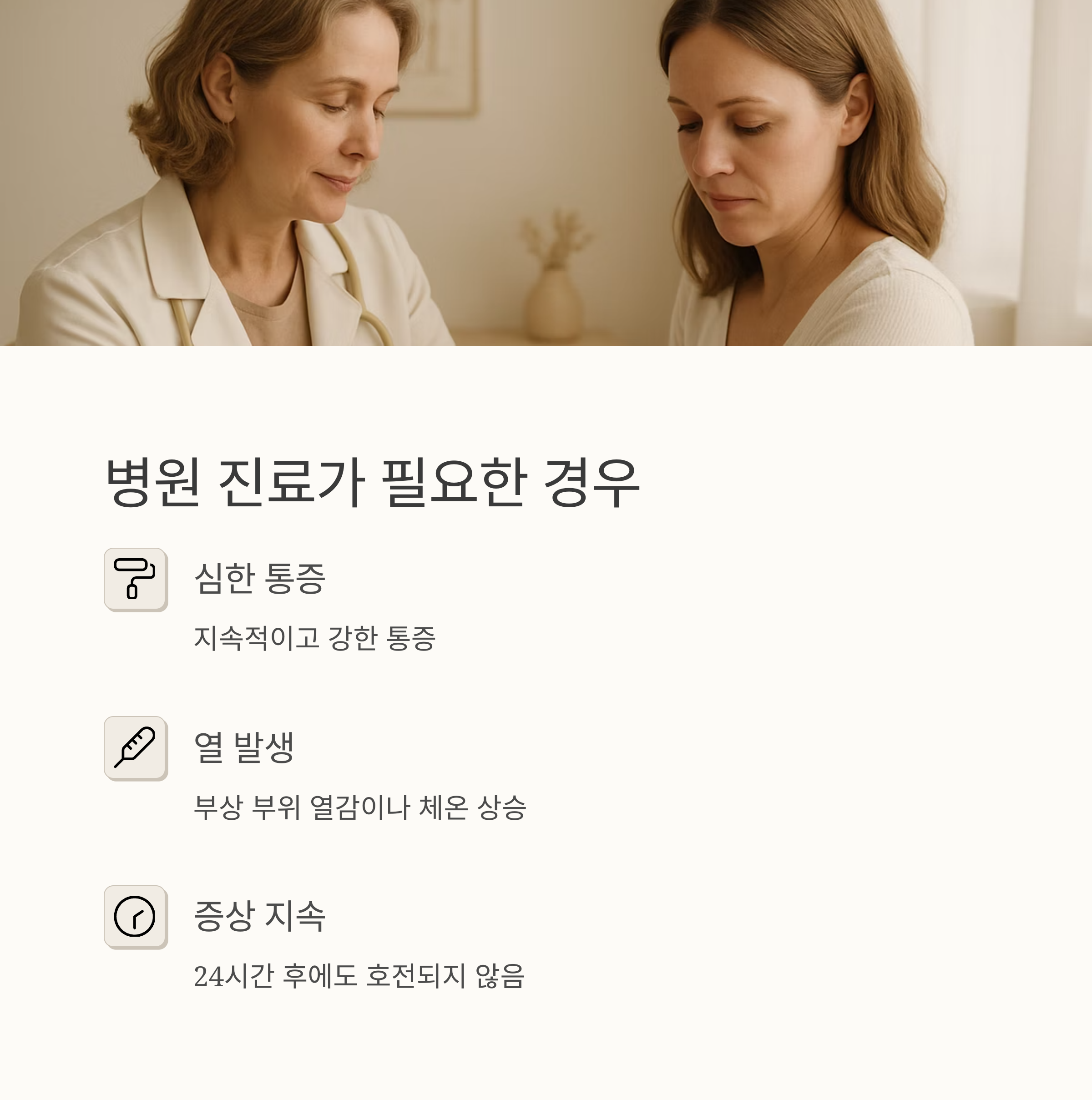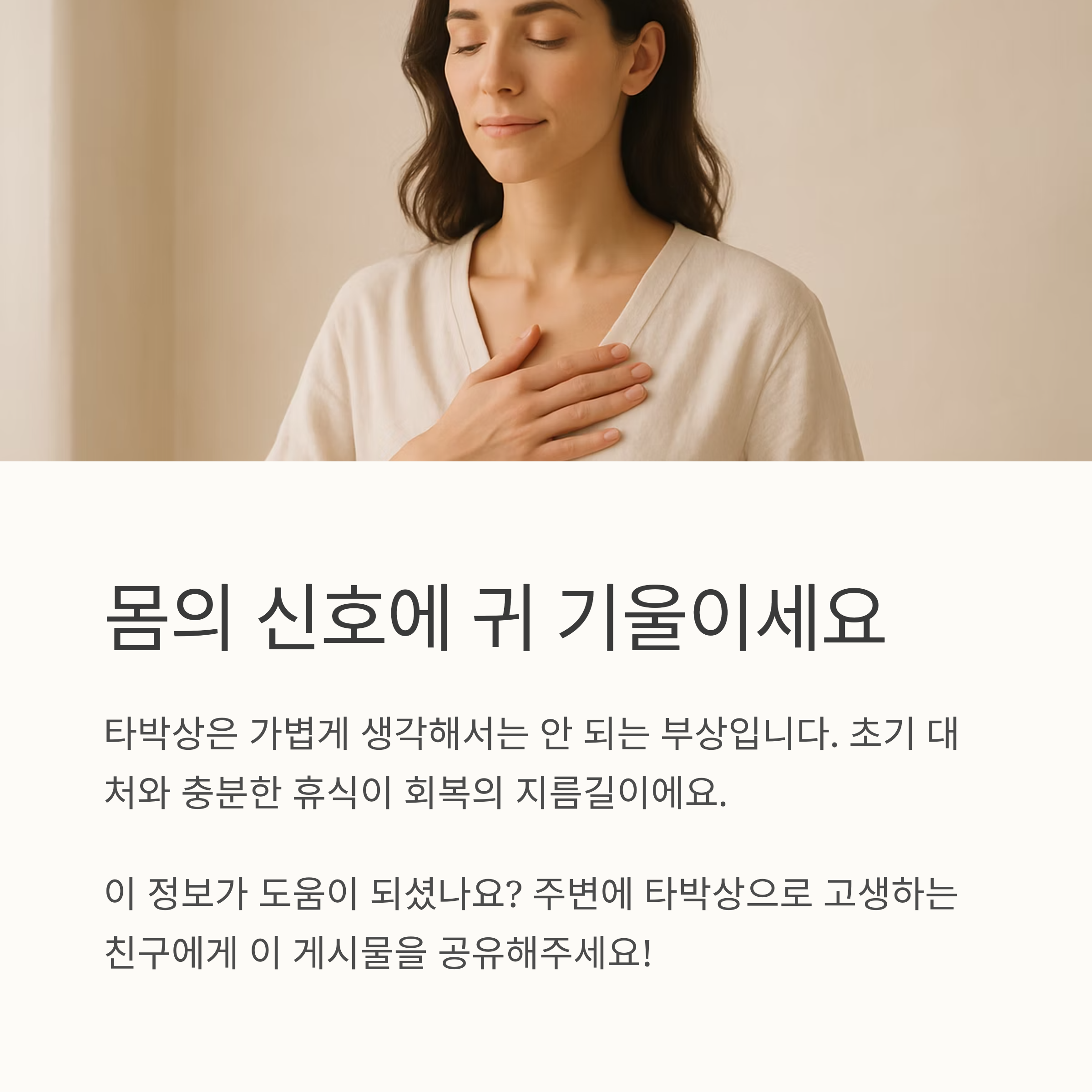 타박상이 가볍다고 생각해서 방치하면 안 돼요. 겉으로 보이는 멍이나 붓기만 보고 판단하면 안 된다는 것을 강조하고 싶어요. 안에 뼈가 금이 갔거나 근육이 파열되었을 수도 있거든요. 통증이 심하거나 붓기가 계속 심해지고 열이 난다면 바로 병원에 가는 것이 가장 좋아요. 그리고 초기 증상이 가벼워도 24시간이 지나도 증상이 호전되지 않으면 의사의 진료를 받는 것이 필요해요.
