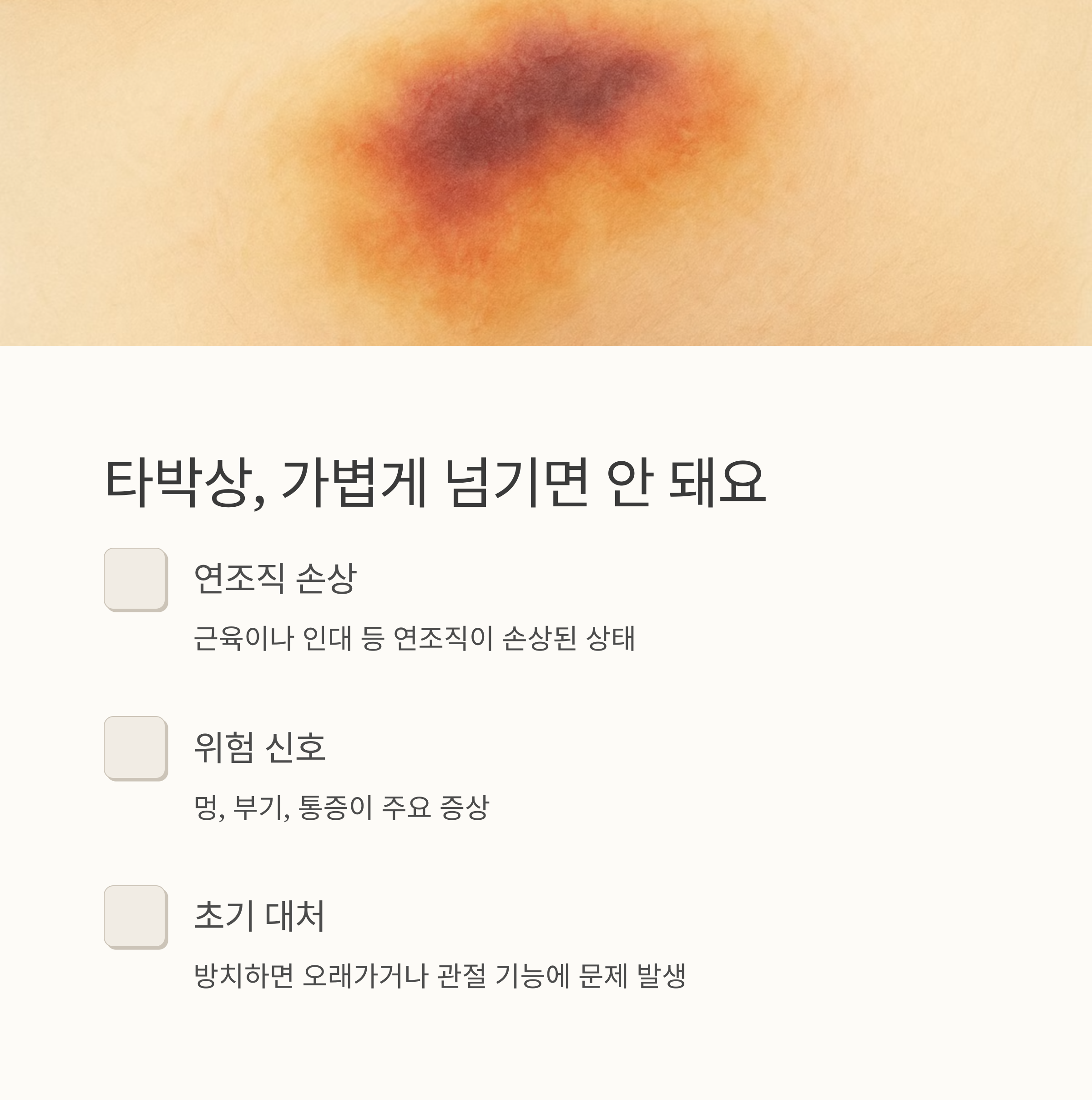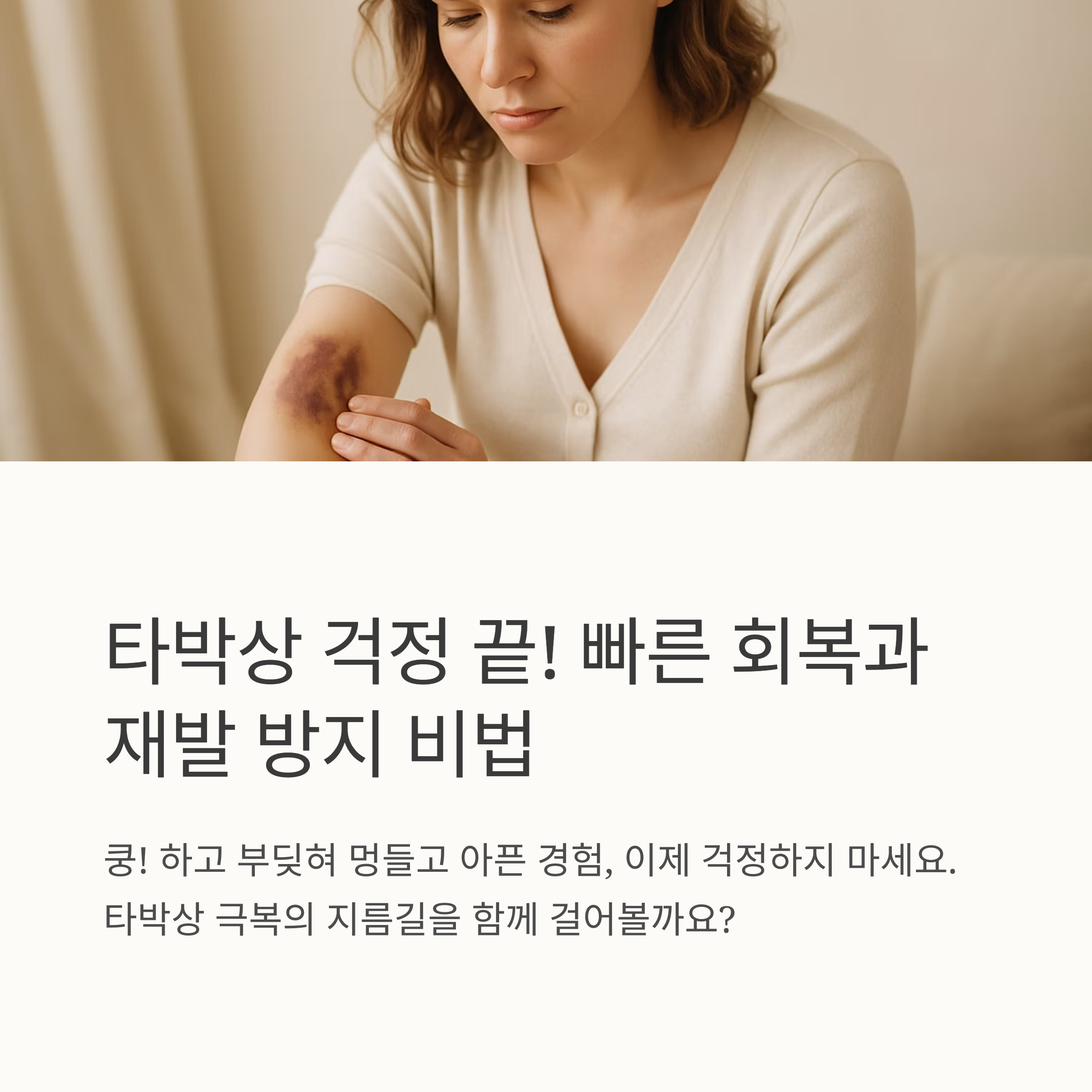 안녕하세요! 혹시 쿵! 하고 부딪히거나 넘어져서 멍들고 아픈 경험 있으신가요? 바로 타박상이죠. 이 글에서는 타박상 빨리 낫는법과 더 중요한, 재발 방지까지 꼼꼼하게 알려드릴게요. 조금만 신경 써도 금방 괜찮아질 거예요! 함께 타박상 극복의 지름길을 걸어보아요!