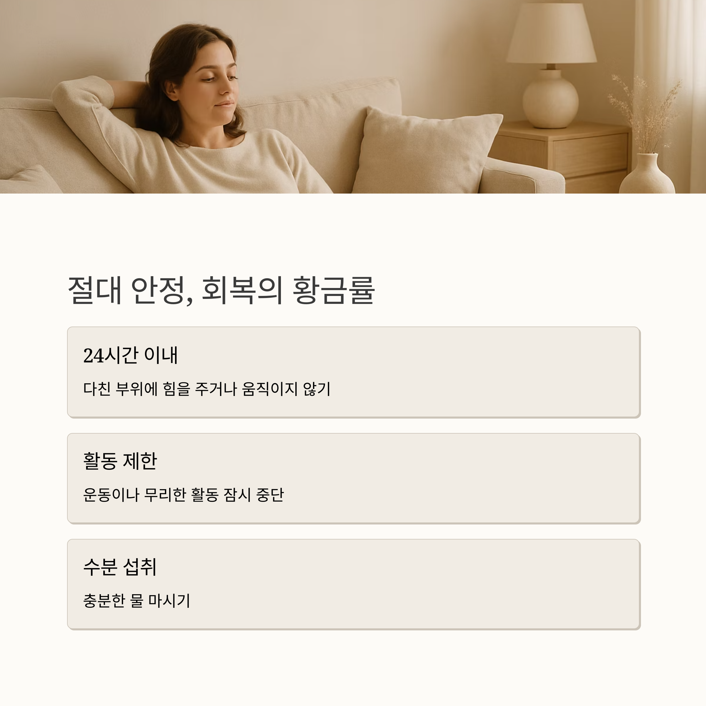 특히 24시간 이내에는 다친 부위에 힘을 주거나 움직이지 않는 것이 무엇보다 중요해요. 다친 부위를 만져보면서 통증의 정도를 체크하는 것도 좋고요. 이 기간 동안 충분히 휴식을 취하면 회복 속도가 훨씬 빨라질 거예요. 그리고 물을 충분히 마시는 것도 잊지 마세요. 몸의 회복에 필요한 수분을 공급해주는 역할을 해요.