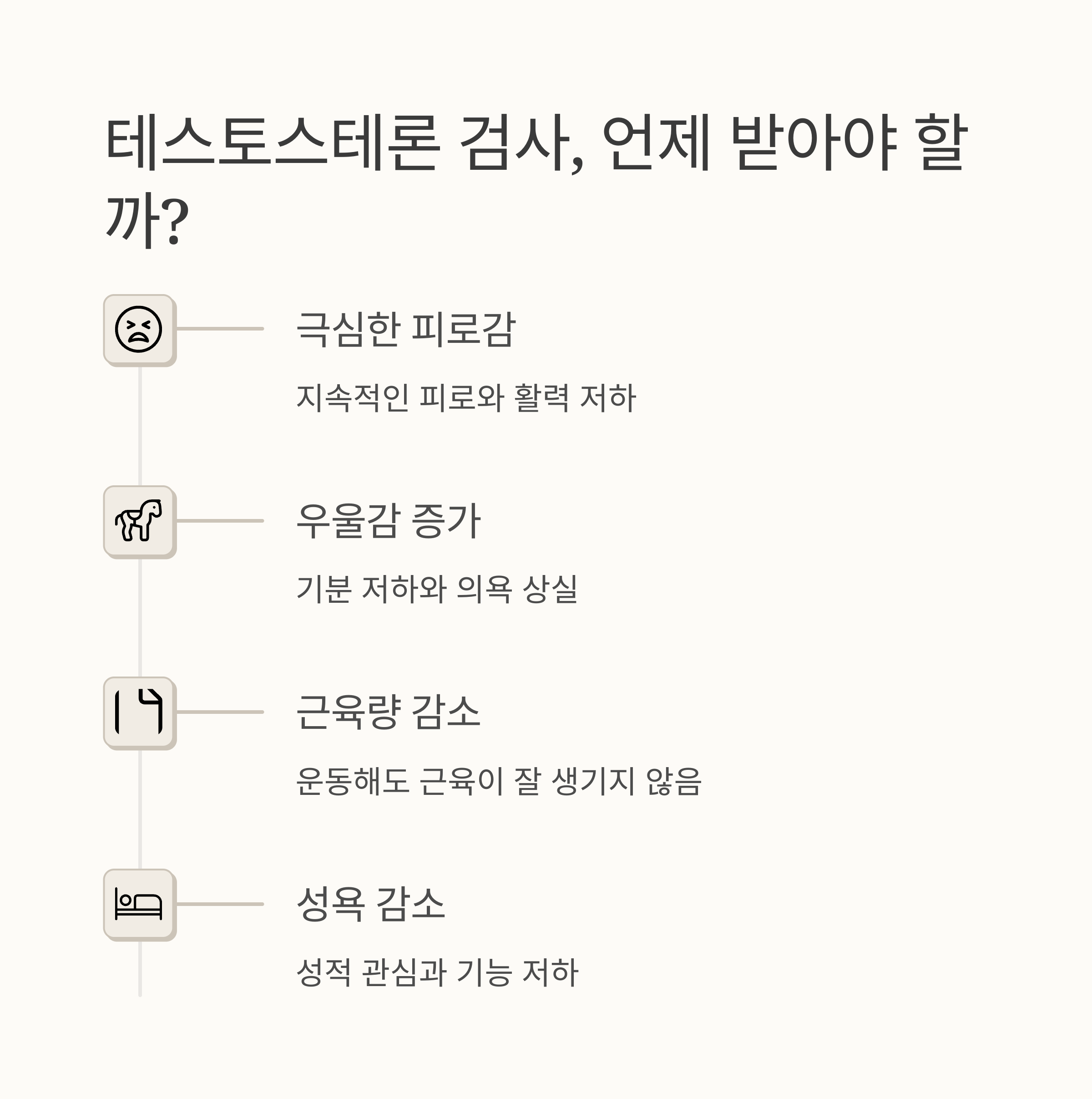 테스토스테론 수치 검사, 언제 받아야 할까요? 갑자기 피곤함이 몰려오거나, 예전 같지 않은 성욕에 고민이라면 한 번쯤 생각해 볼 만해요. 혹시 힘이 부족하거나, 우울함을 자주 느끼진 않나요? 아니면 근육량이 줄어들었다는 생각이 드나요? 이런 증상들이 나타난다면 테스토스테론 수치 검사를 받아보는 게 좋습니다.