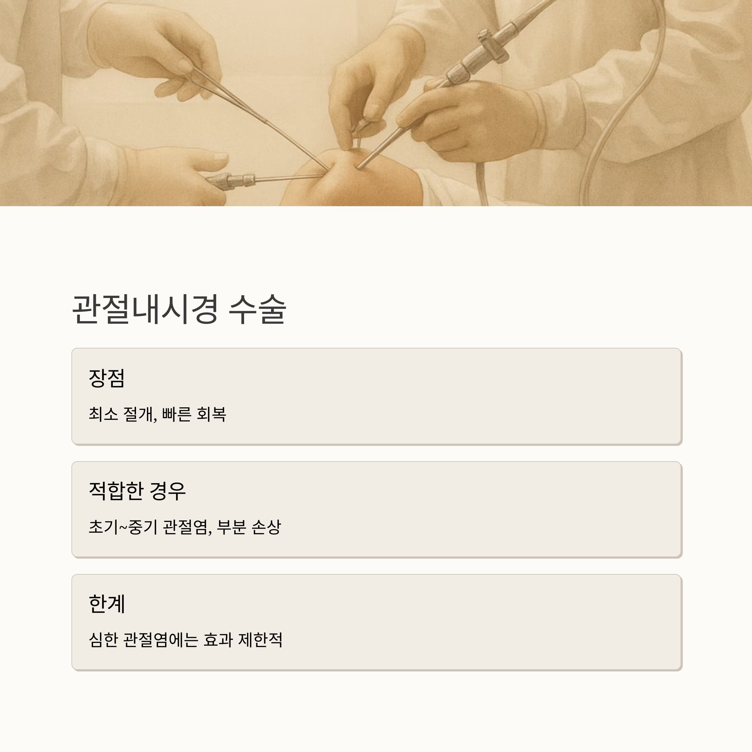 만약 비수술적 치료에도 불구하고 퇴행성관절염 증상이 심각하게 악화되고, 일상생활에 심각한 지장을 초래한다면 수술적 치료를 고려해야 할 수 있습니다. 수술에는 여러 가지 종류가 있는데요, 관절내시경 수술은 관절 내부를 직접 확인하고 손상된 부위를 제거하거나 수리하는 최소침습 수술입니다.