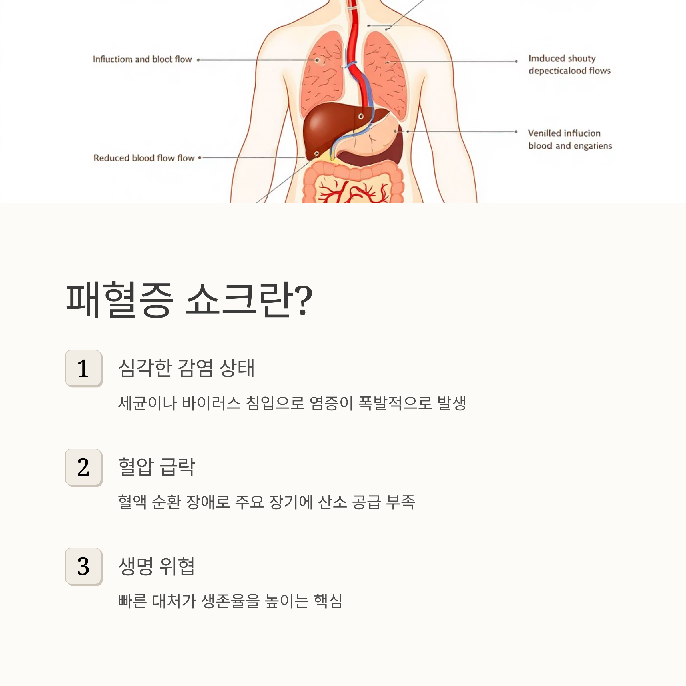그러면 혈액이 제대로 순환되지 않아서 심장, 폐, 콩팥 같은 중요한 장기들이 산소를 제대로 공급받지 못하게 돼요. 결국 장기들이 제대로 일을 못하게 되고, 심하면 생명까지 위협받을 수 있는 무서운 질환이 바로 패혈증 쇼크입니다.