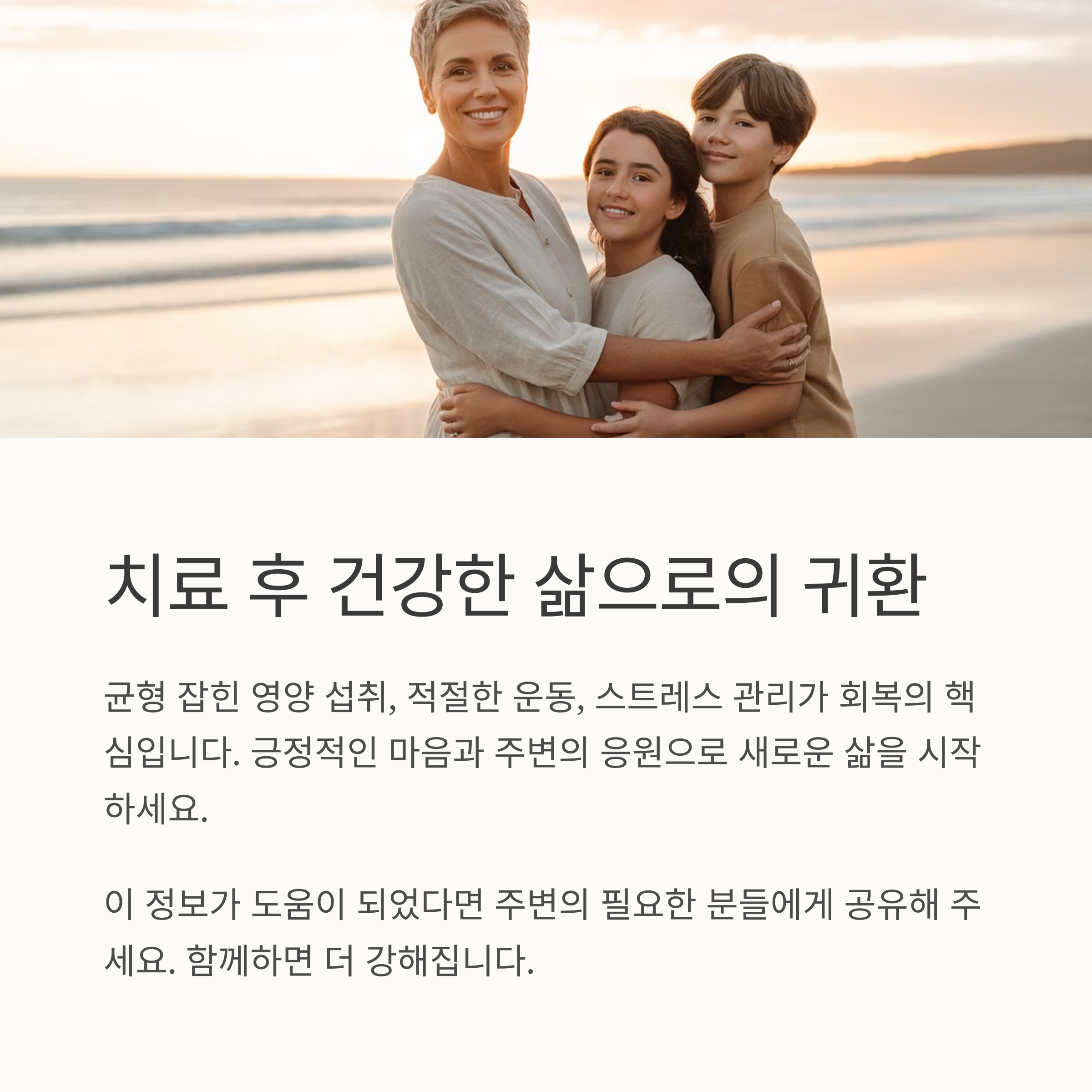 가족, 친구, 의료진과 소통하며 정서적 지지를 받는 것도 잊지 마세요. 힘든 시간이지만, 포기하지 않고 꾸준히 노력한다면 건강을 되찾고 일상생활로 돌아갈 수 있습니다. 긍정적인 마음과 사랑하는 사람들의 응원으로 새로운 삶을 시작해 보세요.
