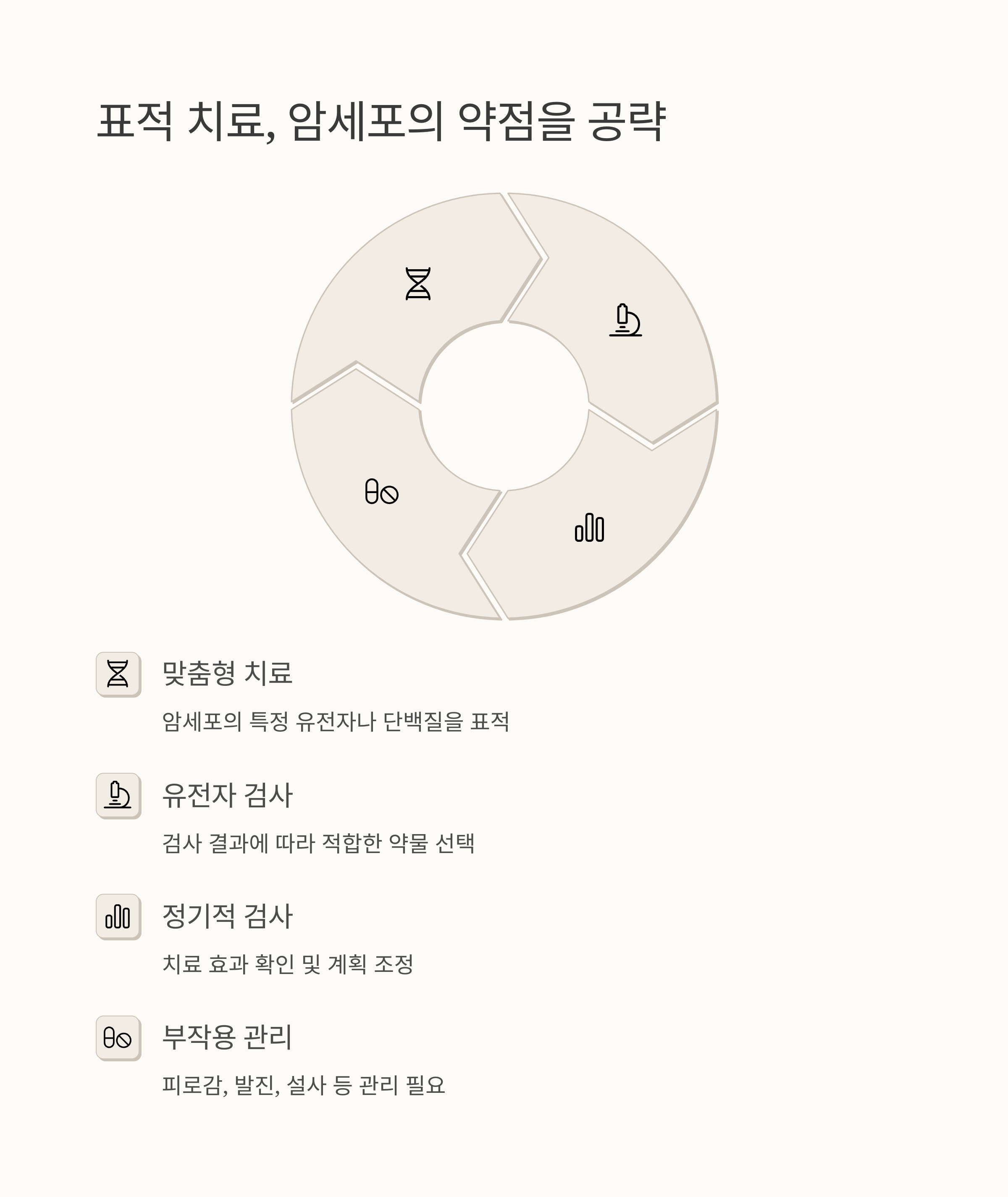 표적 치료는 암세포의 특정 유전자나 단백질을 표적으로 하는 약물을 사용하는 치료법이에요. 항암 화학 요법보다 부작용이 적은 편이고, 특정 유전자 변이가 있는 폐암 환자에게 효과적입니다. 약 종류가 다양하므로, 유전자 검사 결과에 따라 가장 적합한 약을 선택하게 됩니다. 하지만 표적 치료에도 부작용이 없는 것은 아니에요.
