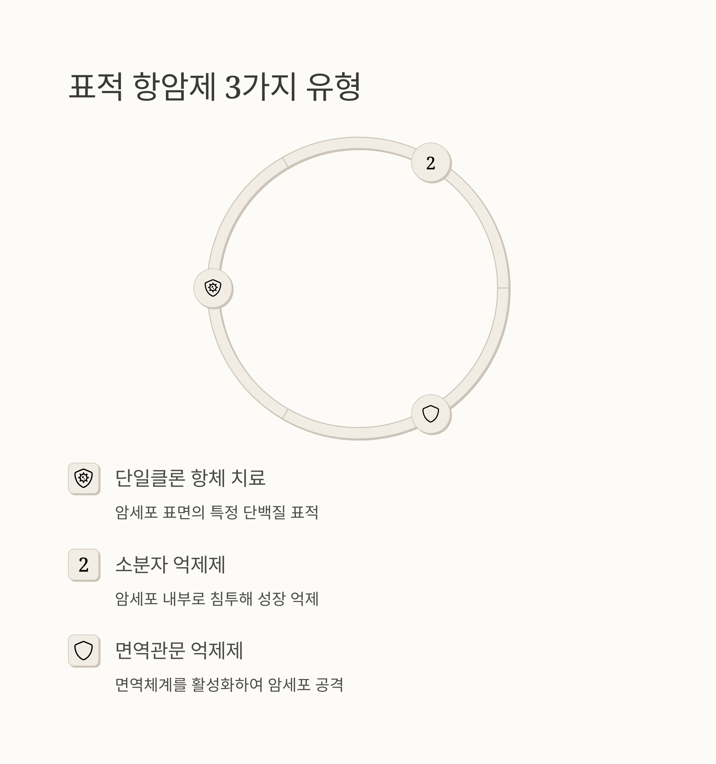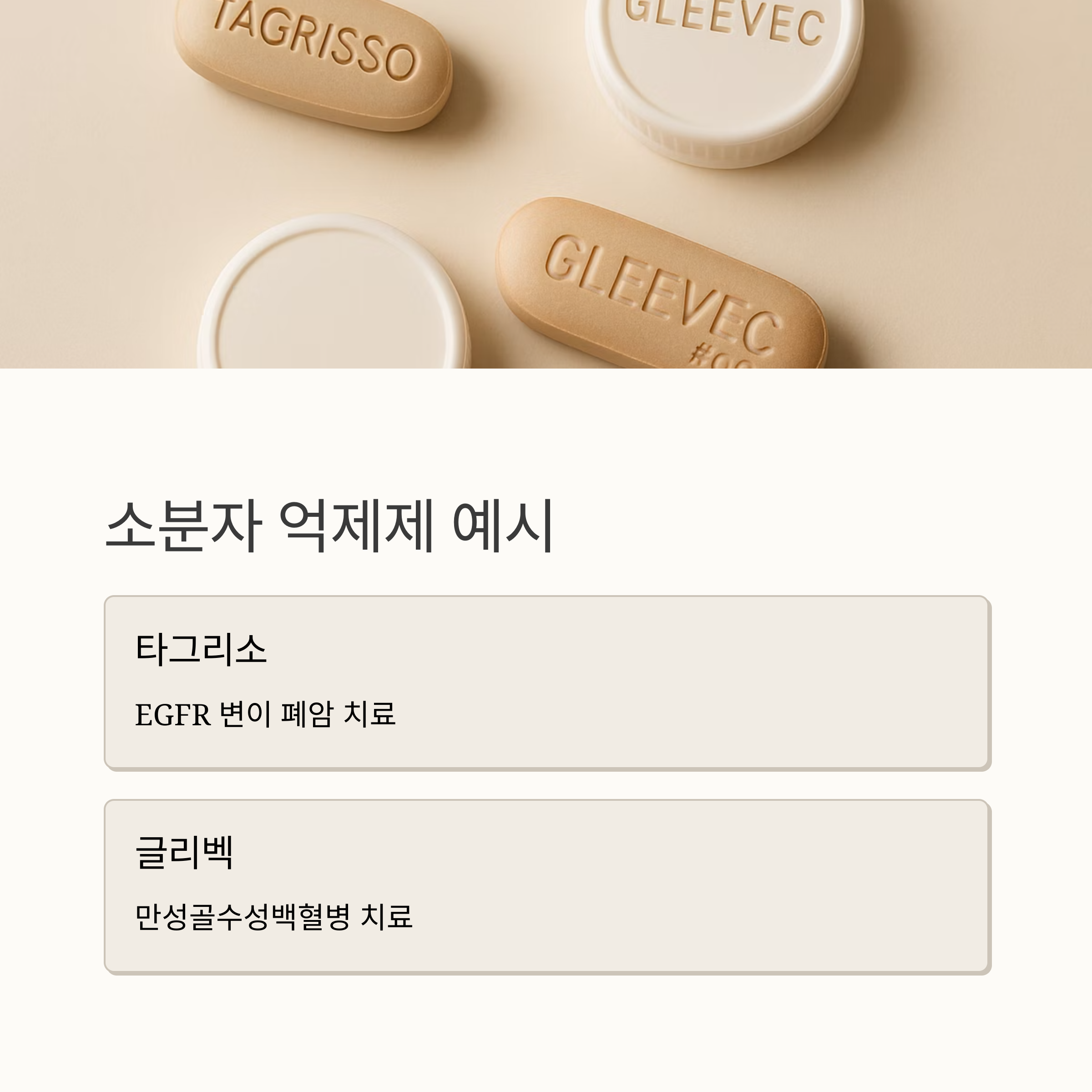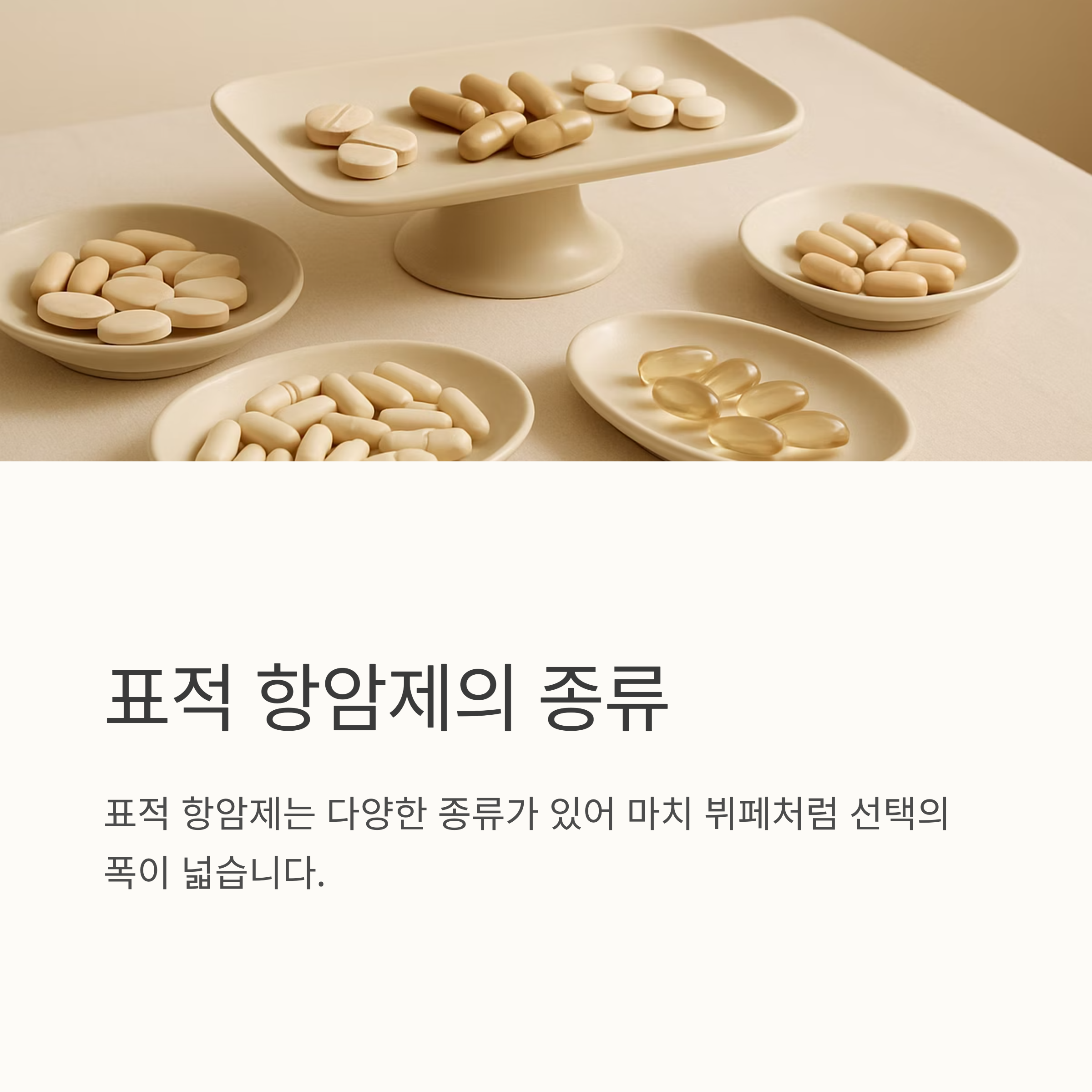 표적 항암 치료 항암제는 종류가 다양해요. 크게 세 가지로 나눌 수 있습니다. 첫째, '단일클론 항체 치료'는 암세포 표면의 특정 단백질을 표적으로 삼아요. 마치 정확한 주소를 찾아가는 배달원처럼요. 허셉틴이나 리툭산이 대표적인 예입니다. 둘째, '소분자 억제제'는 암세포 안으로 들어가 암세포의 성장을 억제하는 약물입니다.