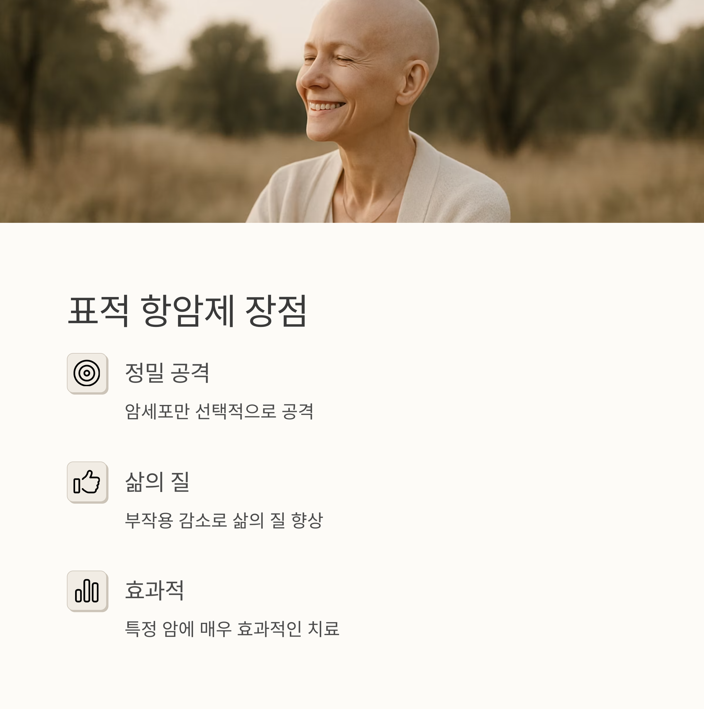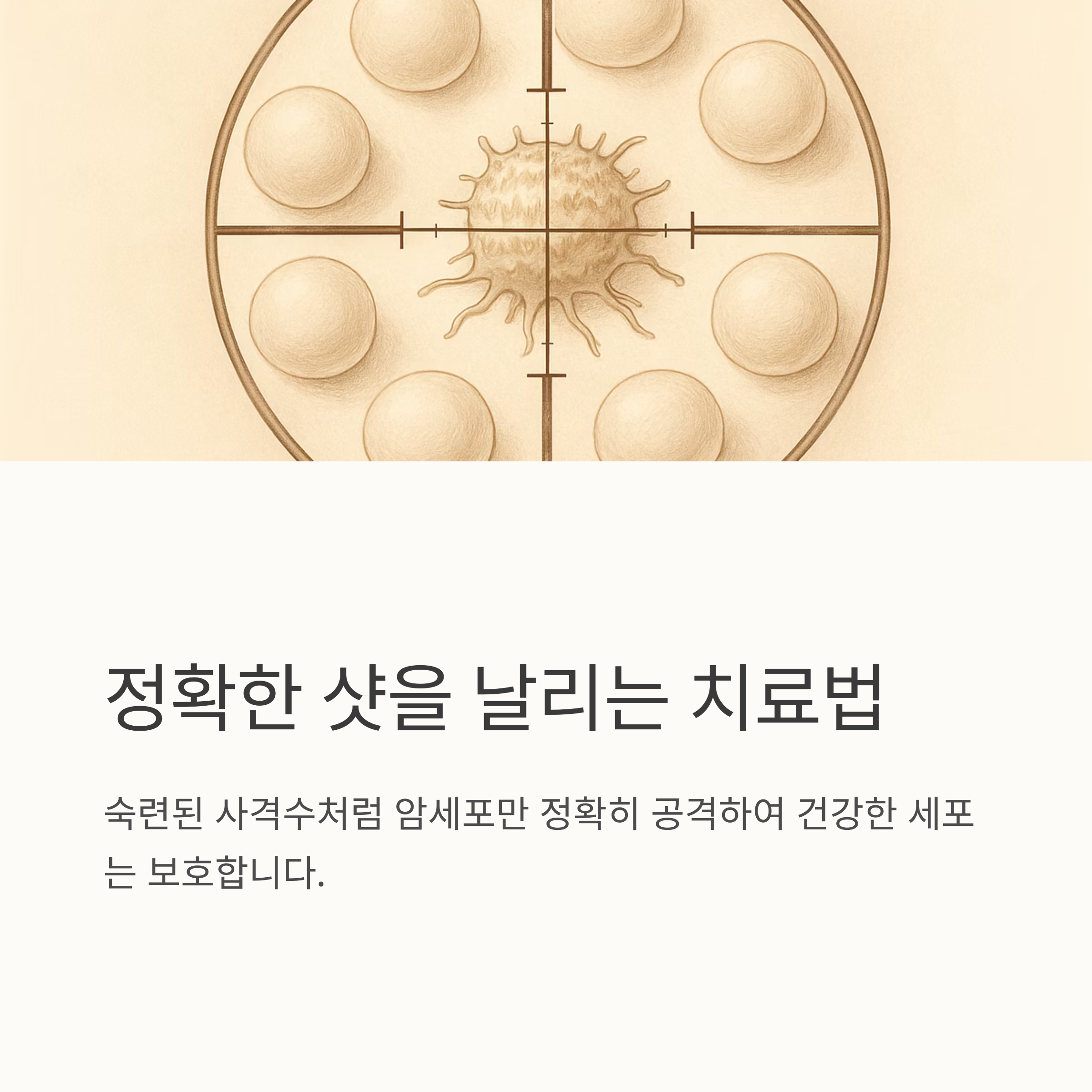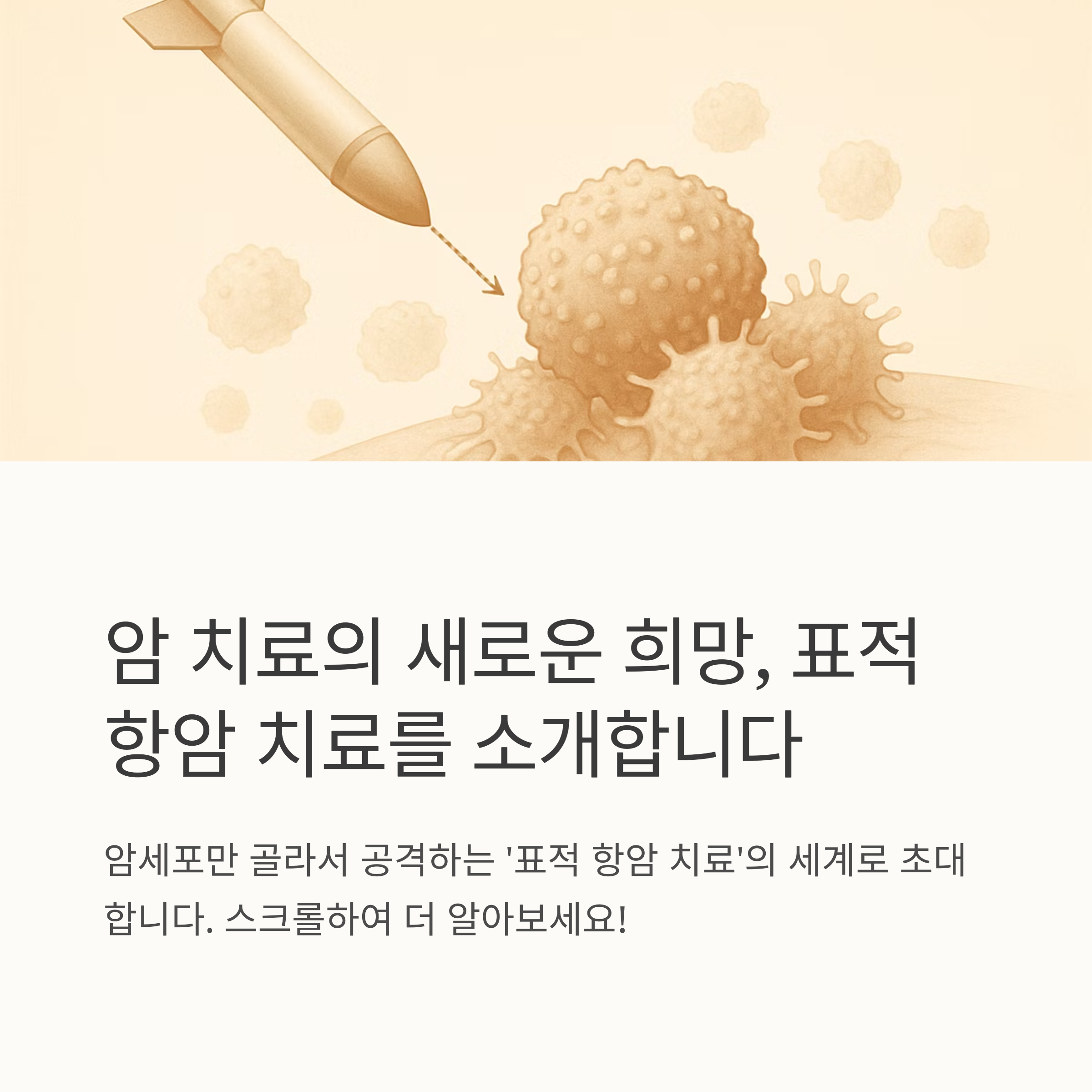 암 치료, 막막하고 두렵죠? 하지만 이제는 암세포만 골라서 공격하는 '표적 항암 치료'라는 희망이 있습니다. 탐색 미사일처럼, 암세포의 특정 약점을 정확히 공격하는 거예요. 예전 항암 치료는 건강한 세포까지 공격해서 부작용이 많았지만, 표적 항암 치료는 암세포에만 집중하니 부작용도 훨씬 적습니다. 숙련된 사격수가 정확한 샷을 날리는 것처럼요.