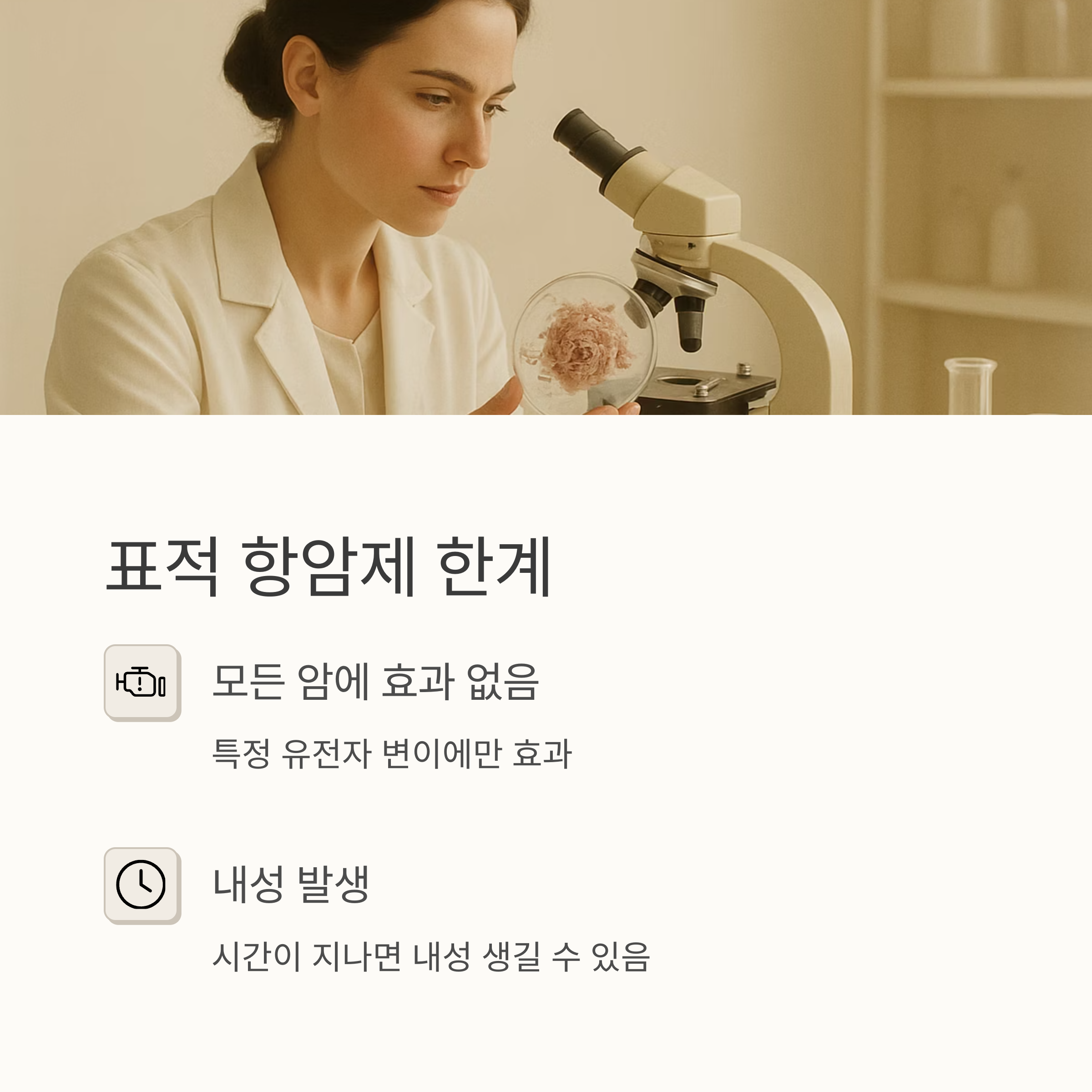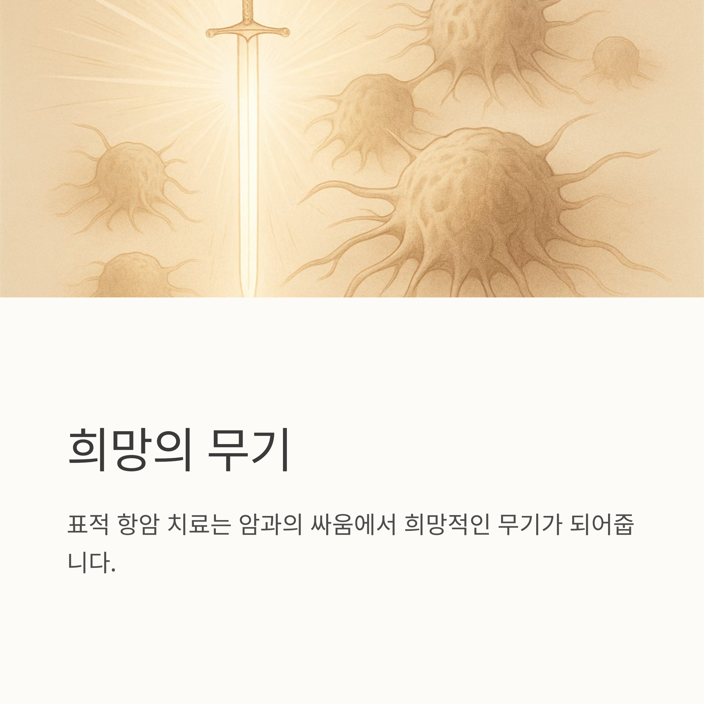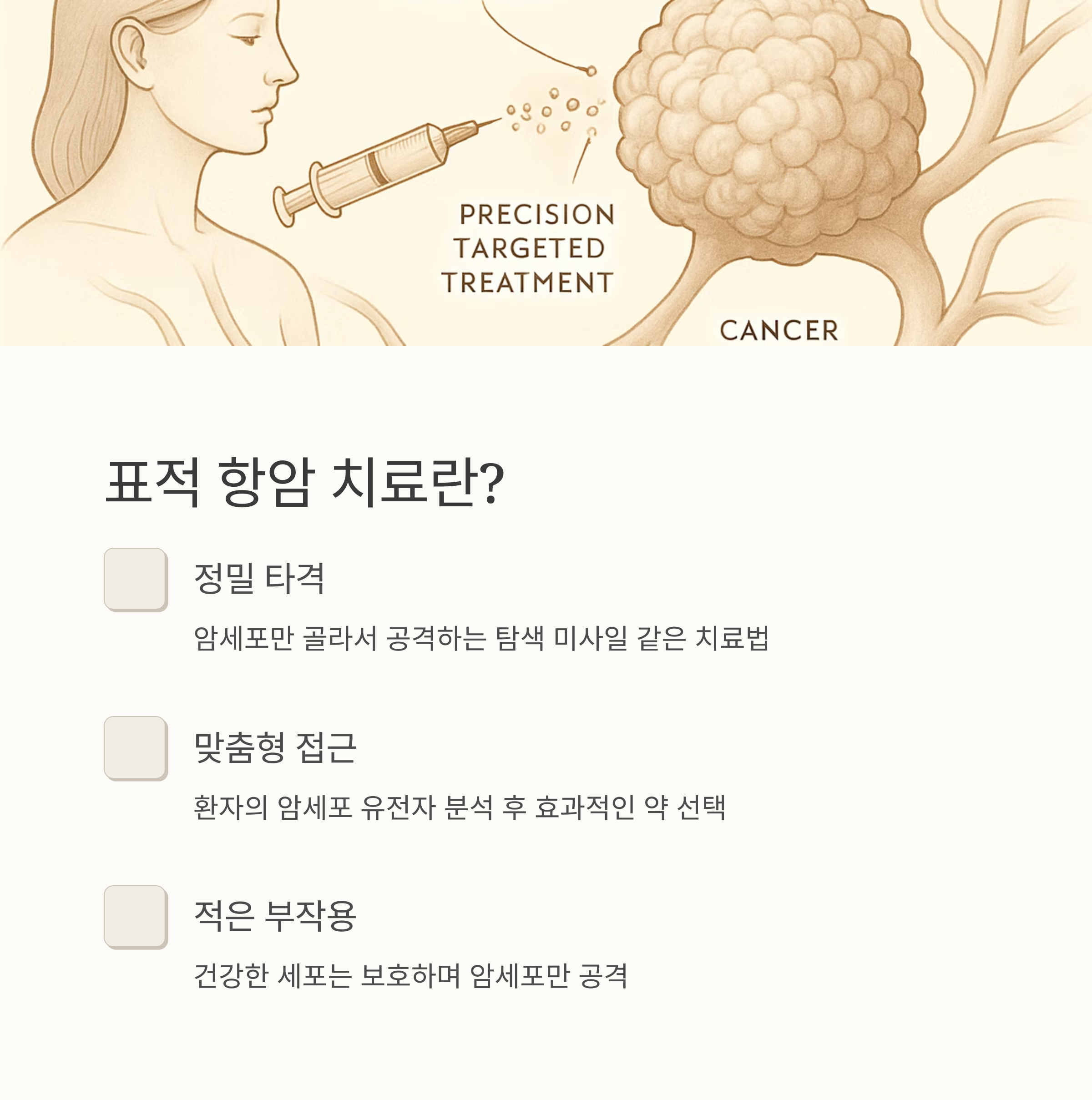 암 치료, 막막하고 두렵죠? 하지만 이제는 암세포만 골라서 공격하는 '표적 항암 치료'라는 희망이 있습니다. 탐색 미사일처럼, 암세포의 특정 약점을 정확히 공격하는 거예요. 예전 항암 치료는 건강한 세포까지 공격해서 부작용이 많았지만, 표적 항암 치료는 암세포에만 집중하니 부작용도 훨씬 적습니다. 숙련된 사격수가 정확한 샷을 날리는 것처럼요.