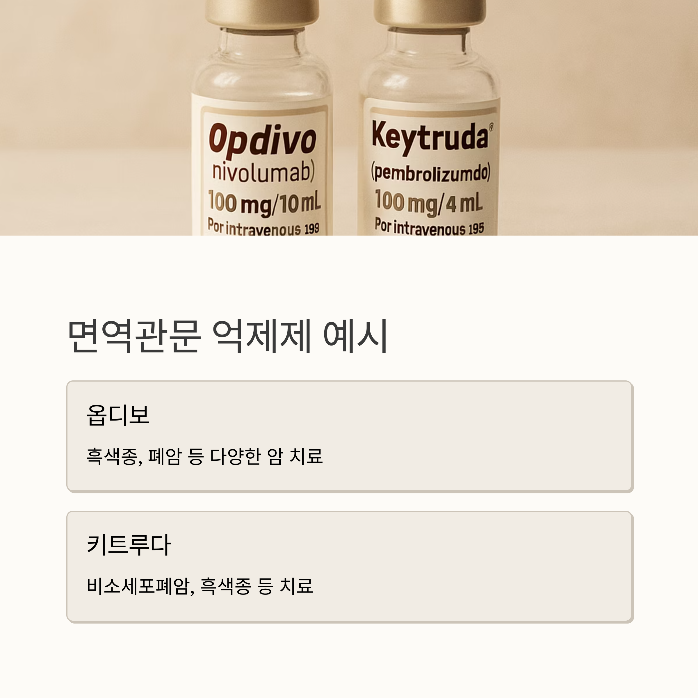 암세포의 에너지 공급을 차단하는 것과 같은 원리죠. 타그리소나 글리벡이 여기에 속하죠. 마지막으로 '면역관문 억제제'는 우리 몸의 면역 체계를 깨워 암세포를 공격하도록 돕습니다. 잠자는 거인을 깨우는 것과 같은 원리죠.