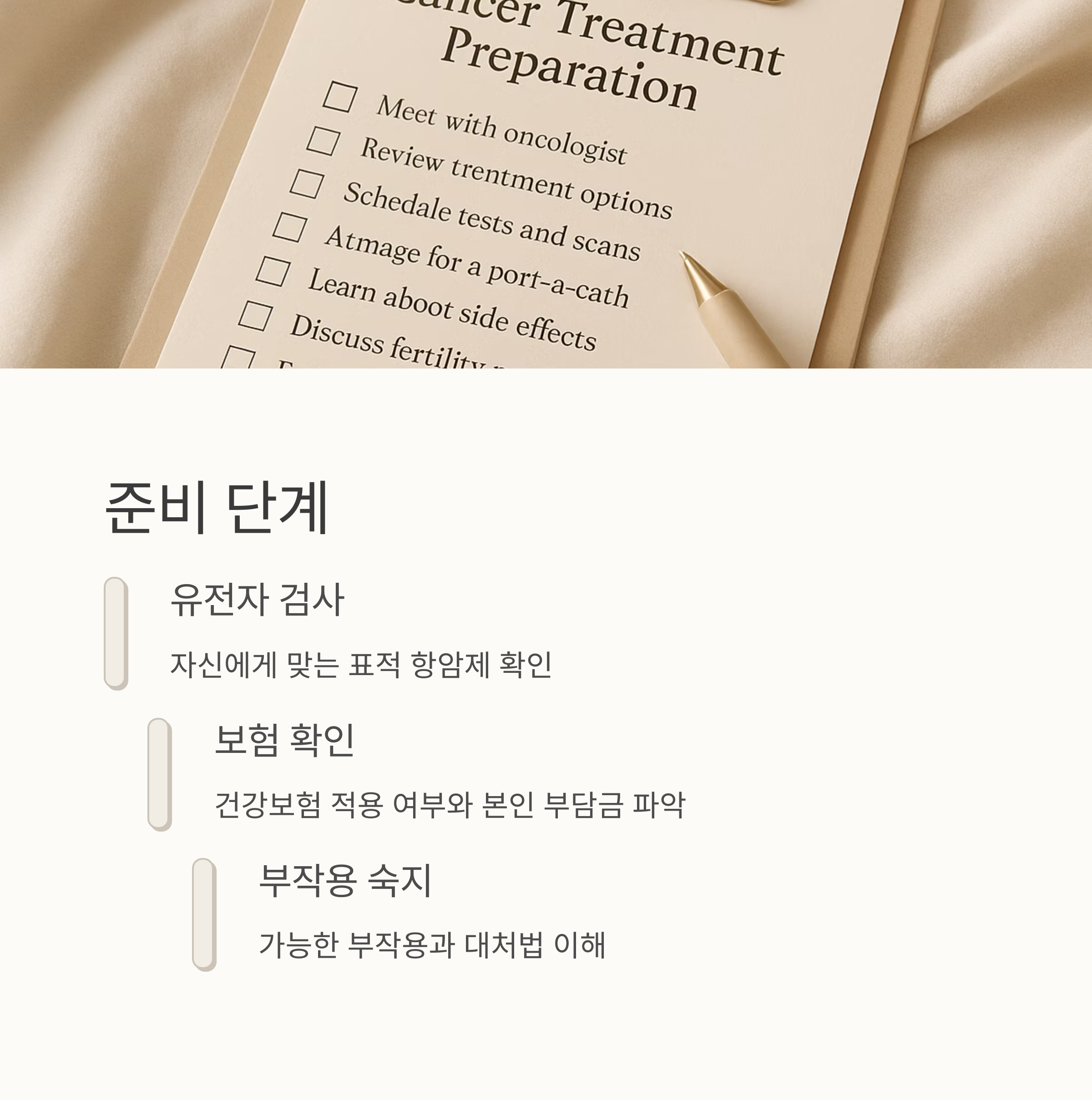 표적 항암 치료는 환자분의 삶의 질 향상에 도움을 줄 수 있지만, 철저한 준비가 필요합니다. 먼저, 자신에게 맞는 표적 항암제가 있는지 유전자 검사를 통해 확인해야 합니다. 그리고 건강보험 적용 여부와 본인 부담금을 미리 알아보는 것이 좋습니다. 또한, 표적 항암제의 부작용에 대한 정보를 충분히 숙지하고, 정기적인 검진을 통해 표적 항암 치료 부작용을 관리하는 것이 중요합니다.