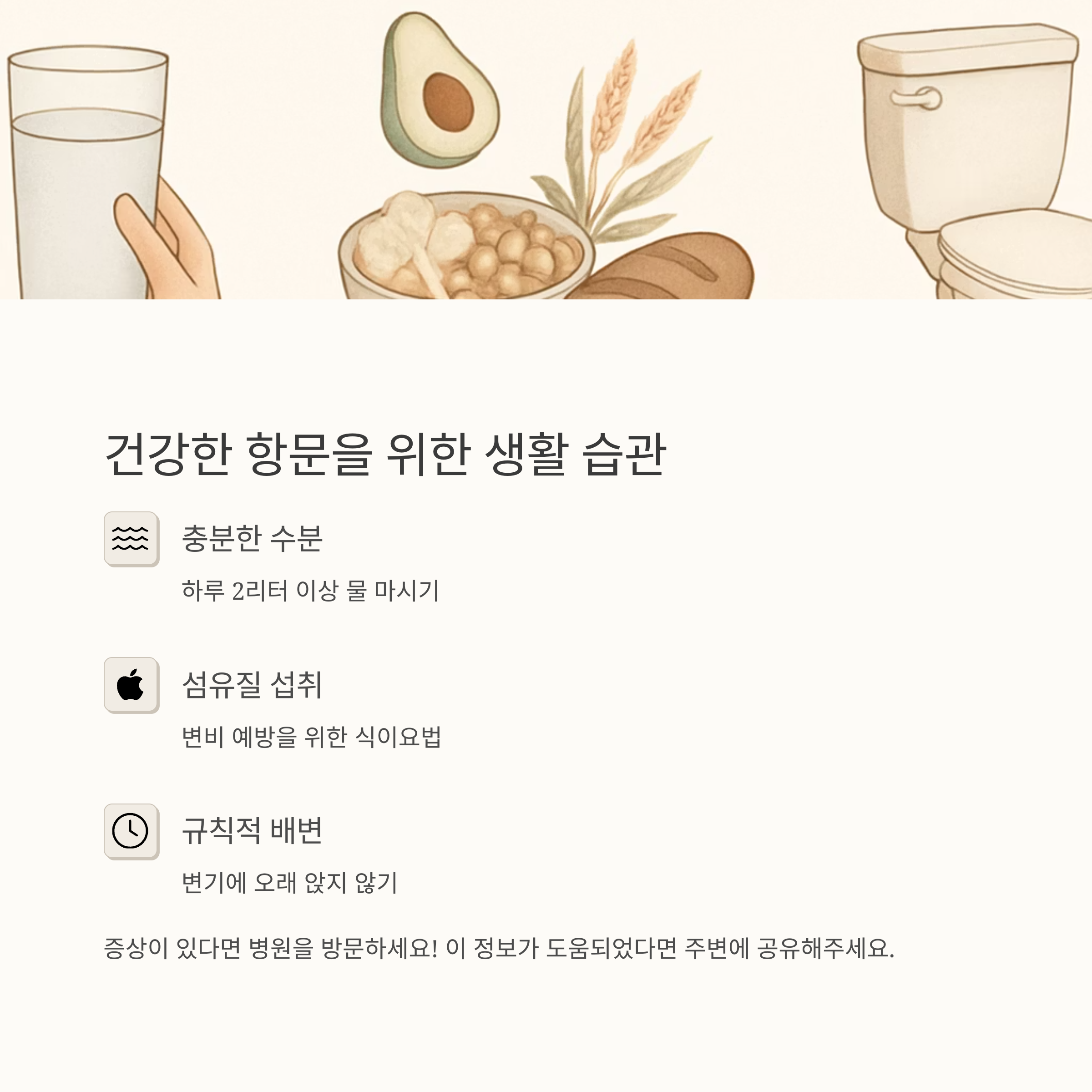 또한, 규칙적인 배변 습관을 들이는 것도 중요해요. 배변 시간을 일정하게 유지하고, 변기에 오래 앉아 있지 않도록 주의해야 합니다. 무리하게 힘을 주는 것도 피해야 하고요. 항문을 깨끗하게 관리하는 것도 잊지 마세요. 배변 후에는 부드럽게 물로 씻어주고, 너무 자극적인 세정제는 사용하지 않도록 합니다.