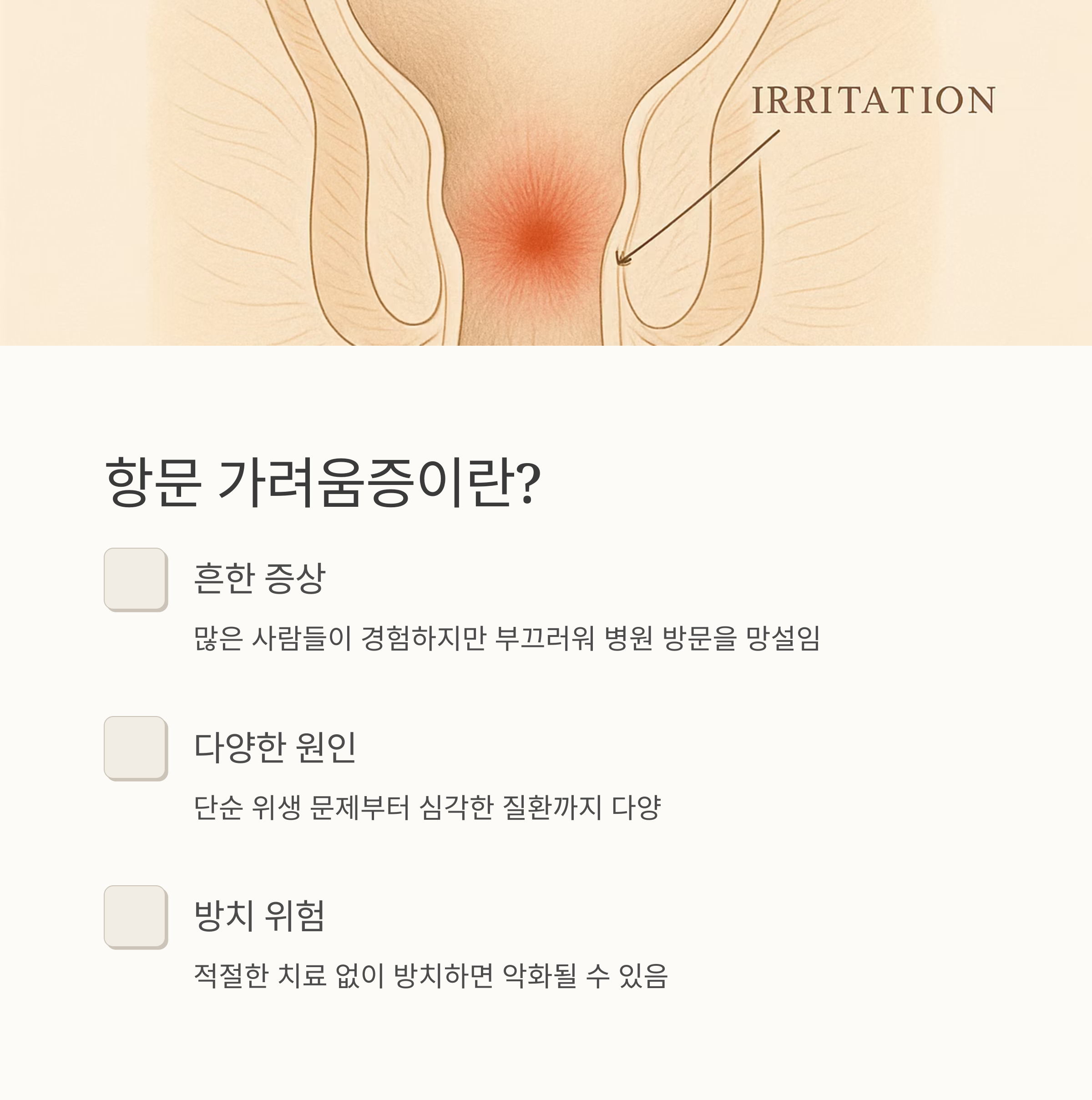 안녕하세요! 항문 가려움증 때문에 고민이신 여러분, 오늘은 여러분의 궁금증을 시원하게 해결해 드리려고 합니다. 항문 가려움증은 정말 흔한 증상이지만, 부끄러워서 병원에 가는 걸 망설이는 분들이 많아요. 하지만 항문 가려움증 원인은 생각보다 다양하고, 방치하면 더 큰 문제로 이어질 수 있답니다.