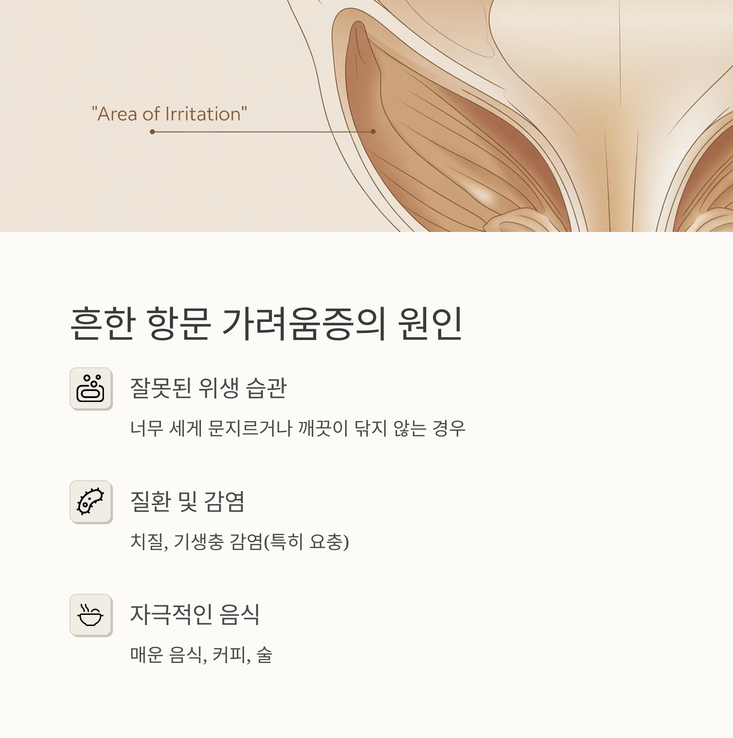 항문 가려움증의 원인은 생각보다 다양해요. 가장 흔한 원인은 잘못된 위생 습관이에요. 항문을 너무 세게 문지르거나, 반대로 깨끗이 닦지 않아서 남아있는 대변 찌꺼기가 가려움증을 유발할 수 있답니다. 향이 강한 비누나 물티슈, 섬유 유연제 같은 자극적인 물질과의 접촉도 문제가 될 수 있고요. 치질이나 기생충 감염도 흔한 원인 중 하나죠.