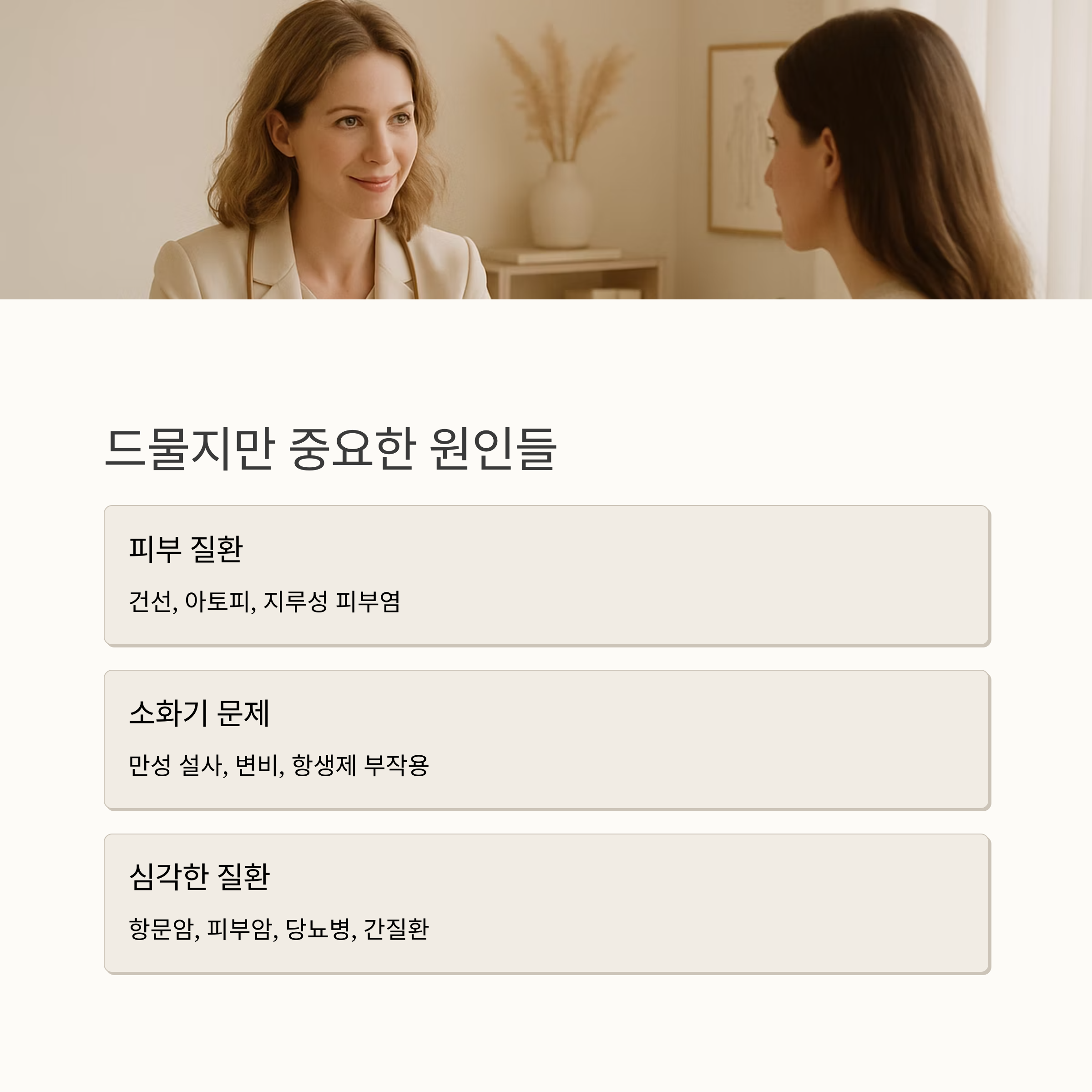 흔한 원인들만으로 설명되지 않는 경우, 다른 질환을 의심해 봐야 할 수도 있어요. 곰팡이 감염이나 피부 질환(건선, 아토피, 지루성 피부염 등)이 있을 수 있고요. 만성 설사나 변비, 장기간의 항생제 복용 역시 장내 환경을 악화시켜 가려움증을 유발할 수 있죠.