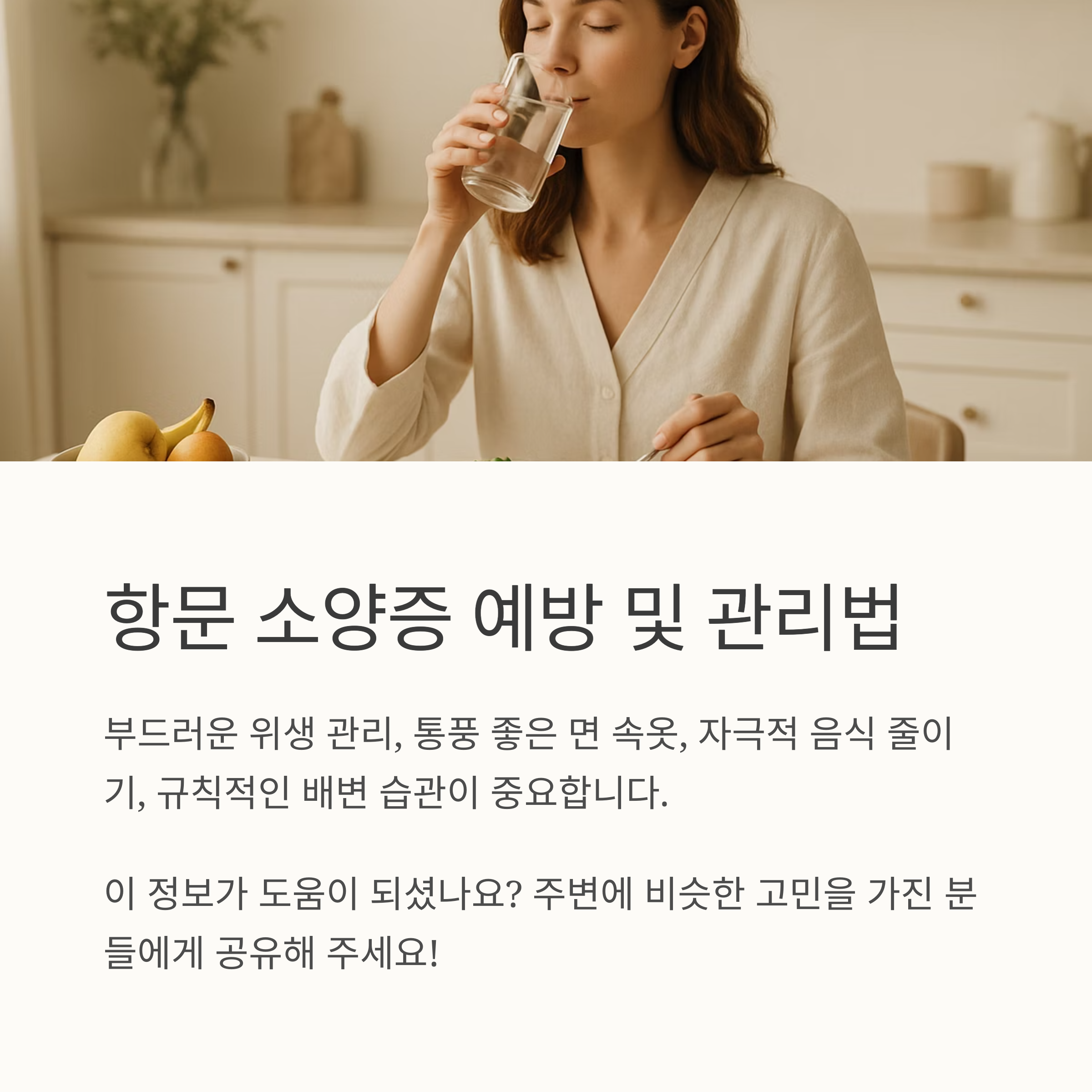 항문 소양증을 예방하고 관리하는 것은 어렵지 않아요. 먼저, 과도한 세정은 피하고 부드럽게 위생 관리를 하는 것이 중요해요. 면 소재의 통풍이 잘 되는 속옷을 입고, 꽉 끼는 옷은 피하는 것도 좋습니다.