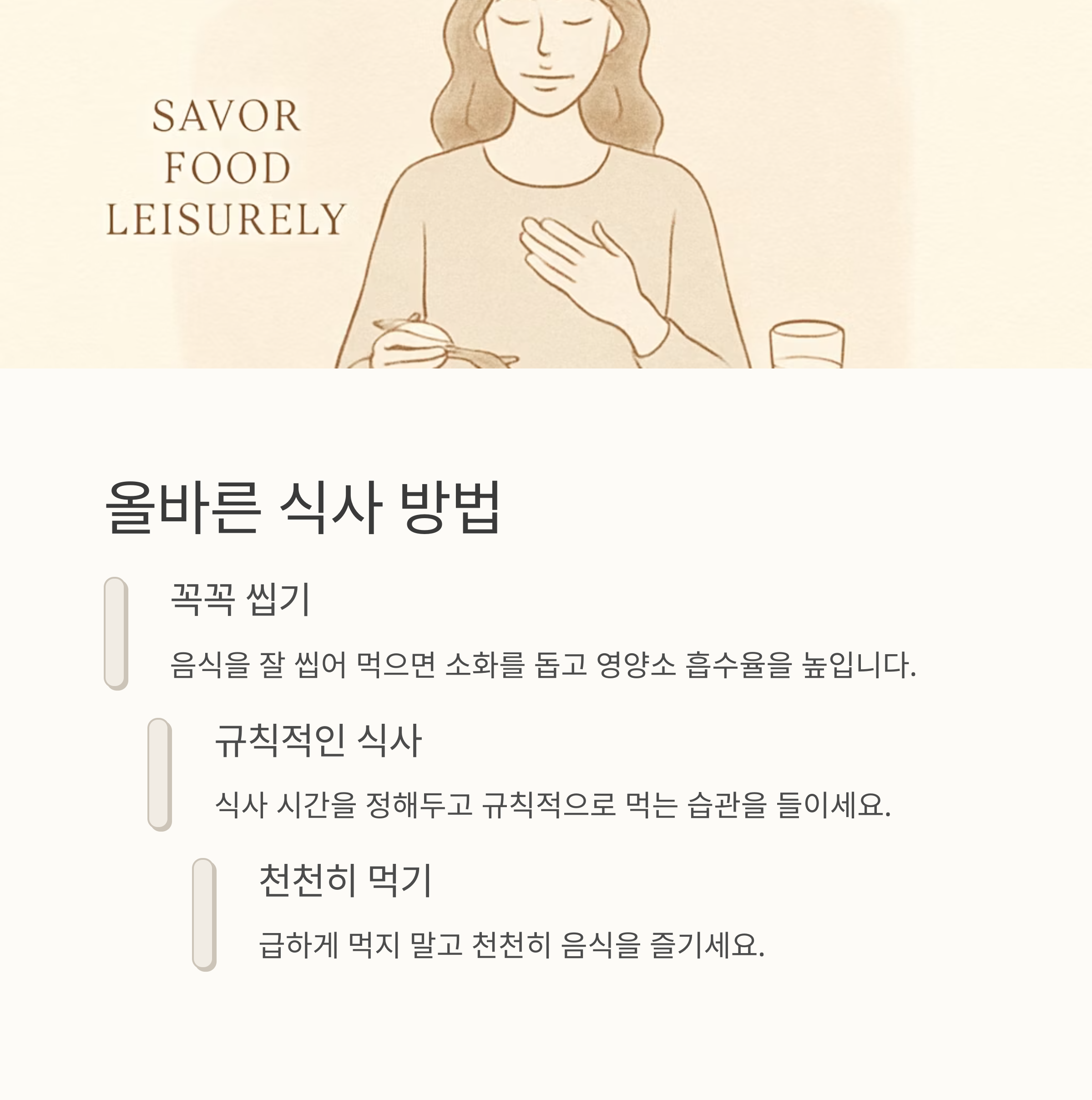 음료 선택뿐 아니라, 음식을 먹는 방식도 중요하답니다. 음식을 꼭꼭 씹어 먹는 것은 소화를 돕고 영양소 흡수율을 높이는 데 도움을 준답니다. 또한 식사 시간을 정해두고 규칙적으로 먹는 습관을 들이는 것도 면역력 유지에 중요해요. 식사 시간을 불규칙하게 하면 소화기능이 떨어지고, 이는 면역력 저하로 이어질 수 있답니다. 작은 습관 하나하나가 건강한 삶을 만드는 중요한 요소들이니 꾸준히 노력하는 것이 중요하겠죠?