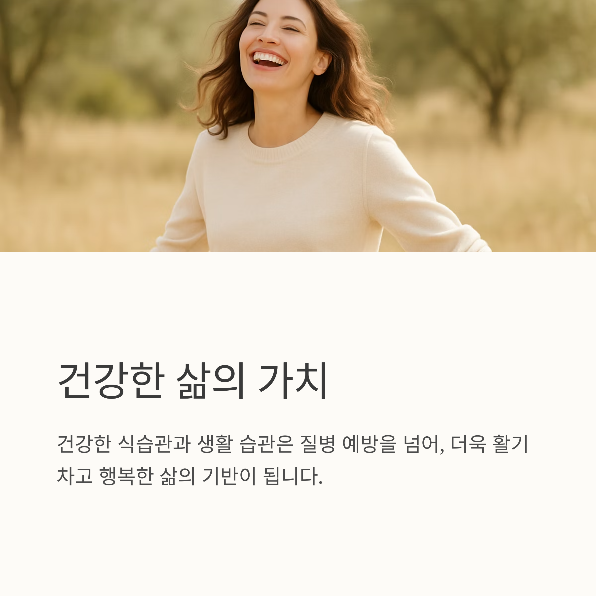 건강한 식습관과 생활 습관은 단순히 질병 예방을 넘어, 더욱 활기차고 행복한 삶을 위한 기반이 된답니다. 하루아침에 변화가 나타나지는 않겠지만, 꾸준히 노력한다면 분명 건강하고 행복한 미래를 만들어갈 수 있을 거예요. 이 글이 건강한 삶을 위한 작은 시작점이 되길 바라며, 오늘부터 바로 실천해 보세요! 매일매일 건강을 챙기는 습관은 우리 삶의 질을 높이는 가장 큰 선물이 될 거예요. 건강한 삶을 향한 긍정적인 마음으로 오늘 하루도 힘차게 시작해 보아요!