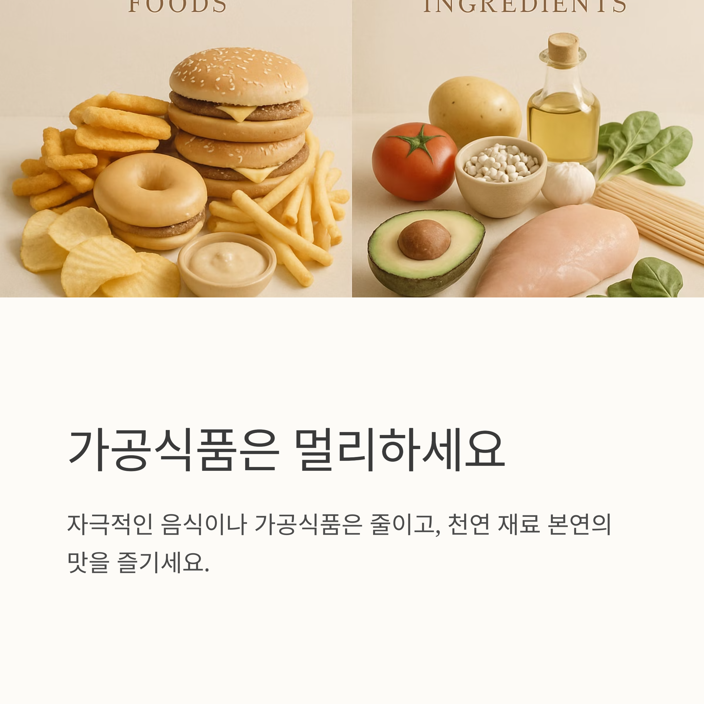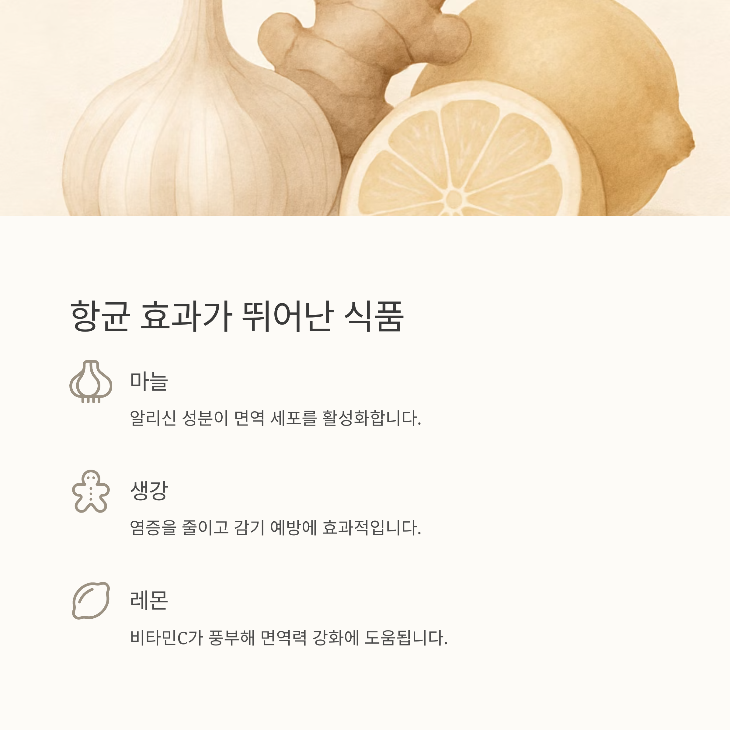 마늘과 생강처럼 향긋한 채소들은 항균, 항바이러스 효과까지! 매일 밥상에 올리는 음식 하나하나가 면역력을 좌우하는 만큼, 신선하고 다양한 식재료로 균형 잡힌 식단을 꾸리는 게 중요해요. 자극적인 음식이나 가공식품은 가급적 줄이고, 천연 재료 본연의 맛을 즐겨보는 건 어떨까요? 몸이 건강해지는 기분 좋은 변화를 느낄 수 있을 거예요! 우리 몸에 좋은 영양소를 골고루 섭취하면서 건강을 챙겨보자구요!