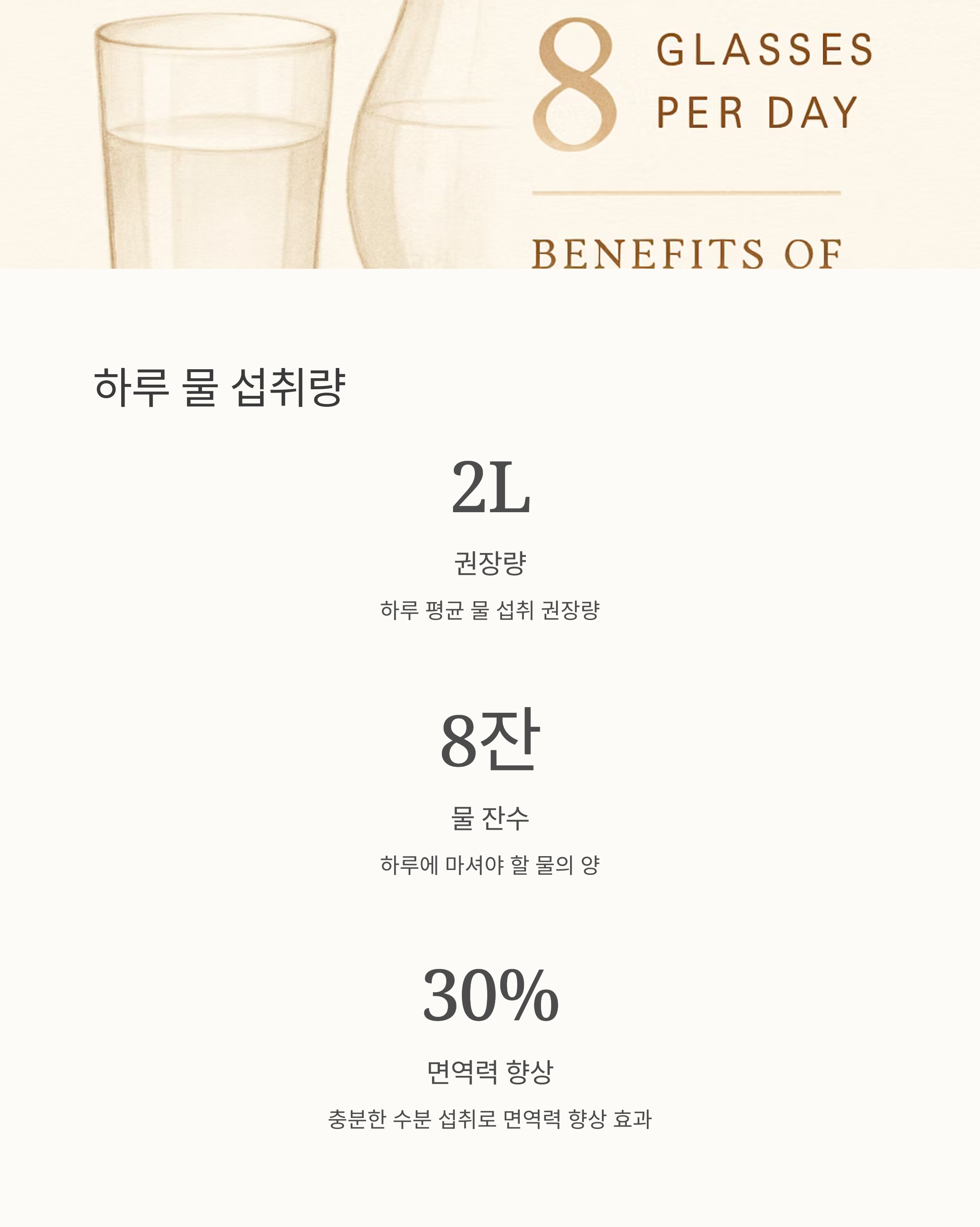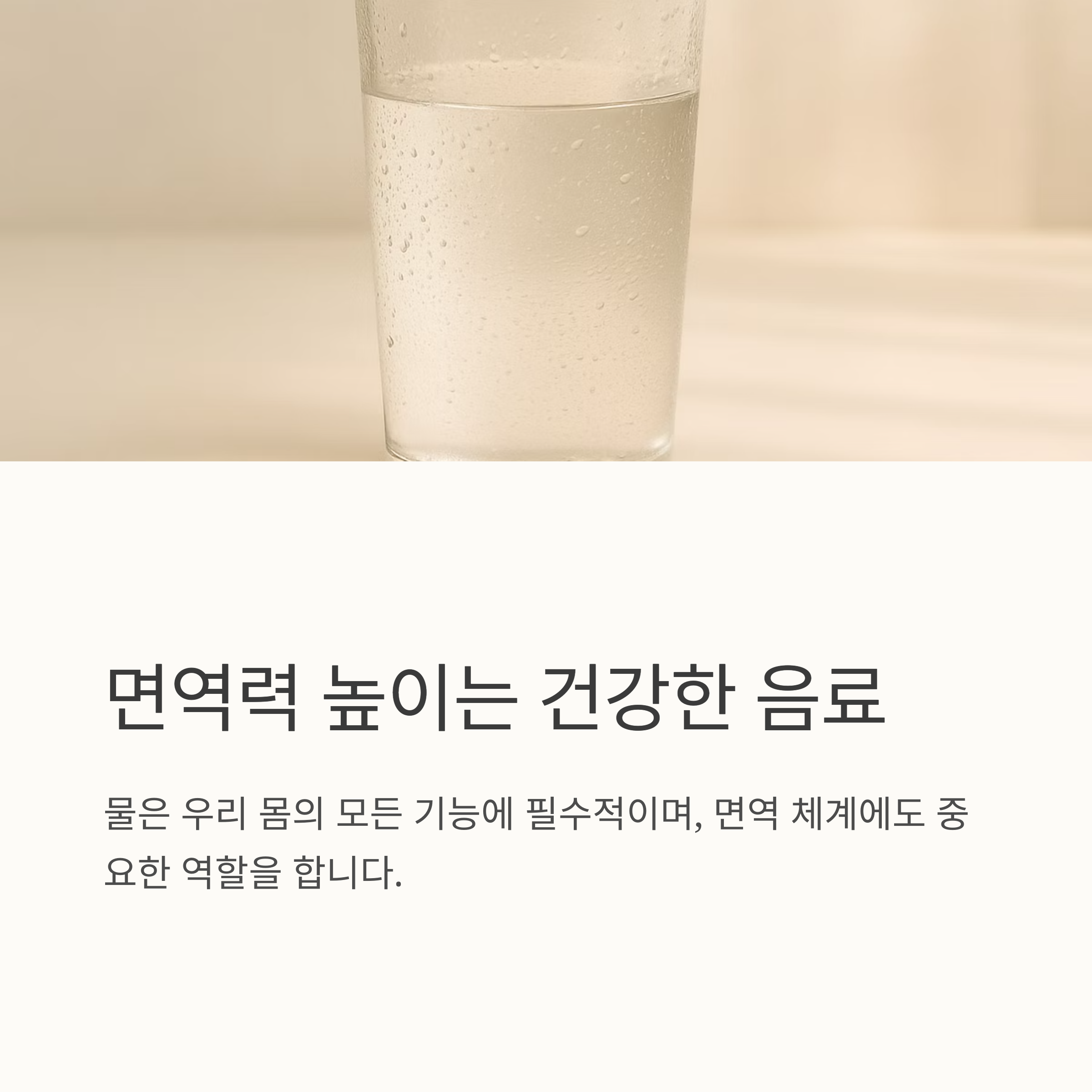 물은 우리 몸의 모든 기능에 필수적인 요소이고, 면역 체계에도 중요한 역할을 한답니다. 하루에 충분한 물을 마시는 것은 건강한 몸을 유지하는 가장 기본적인 방법이에요. 물 대신 탄산음료나 과도한 설탕이 들어간 음료를 섭취하면 오히려 면역력이 떨어질 수 있으니 주의해야 해요. 대신 면역력 증진에 도움이 되는 음료를 선택해 보는 건 어떨까요?