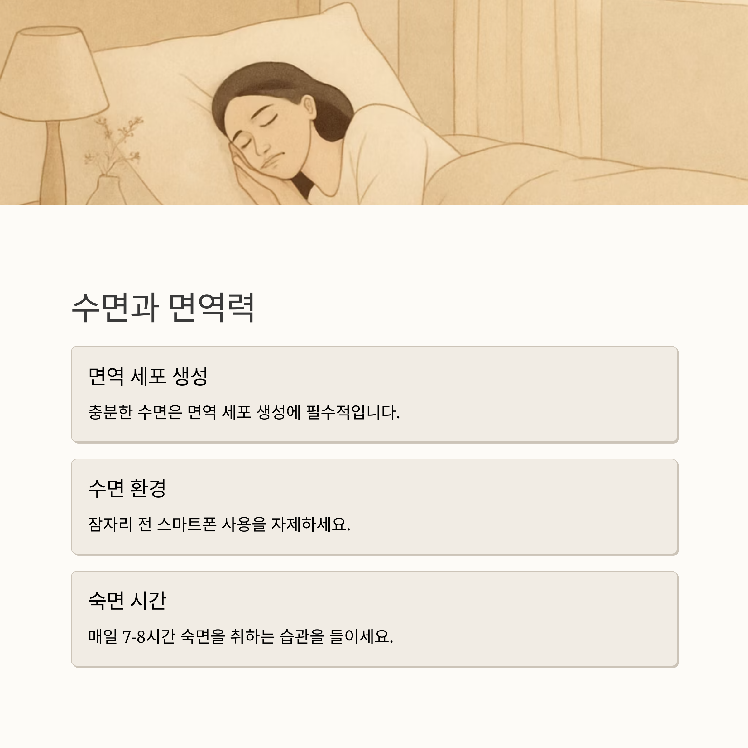 운동은 혈액 순환을 원활하게 해주고, 면역 세포 활동을 활성화시켜 감기나 독감 같은 질병으로부터 우리 몸을 보호해줘요. 그리고 충분한 수면도 빼놓을 수 없어요. 잠을 충분히 자야 면역 세포가 제대로 만들어지고 활동할 수 있거든요. 매일 7-8시간 정도 숙면을 취하는 습관을 들여보세요. 잠자리에 들기 전에는 스마트폰 사용을 자제하고, 편안한 분위기를 만들어주는 것도 도움이 된답니다.