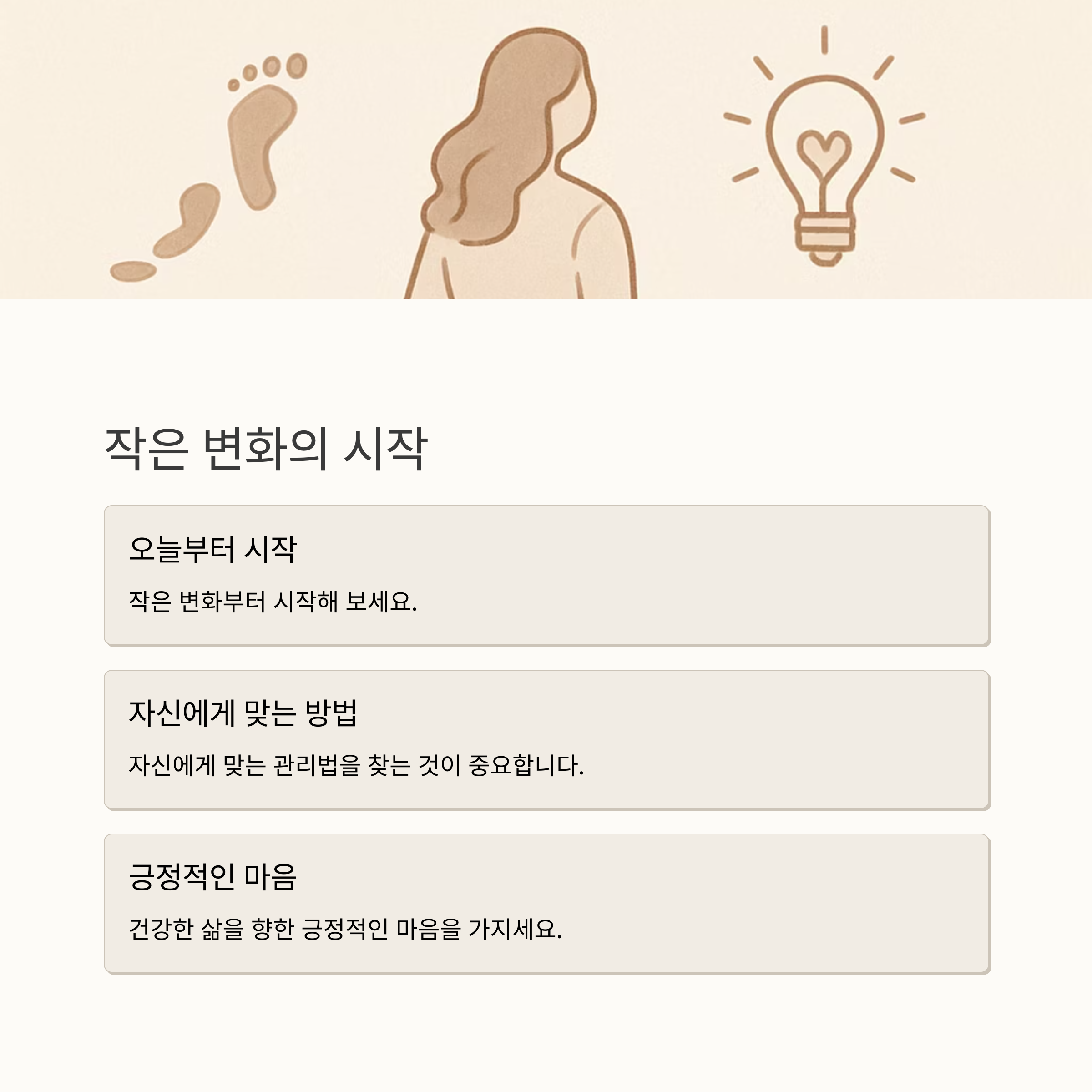 오늘 알려드린 방법들을 하나씩 실천해 보면서 자신에게 맞는 꾸준한 관리법을 찾는 것이 중요해요. 어떤 방법이든, 꾸준히 실천하는 것이 가장 중요하다는 것을 잊지 마세요! 오늘부터 조금씩 변화를 시도하면서 건강한 삶을 만들어 나가요! 우리 모두 건강하고 행복한 삶을 살아가길 바랍니다!