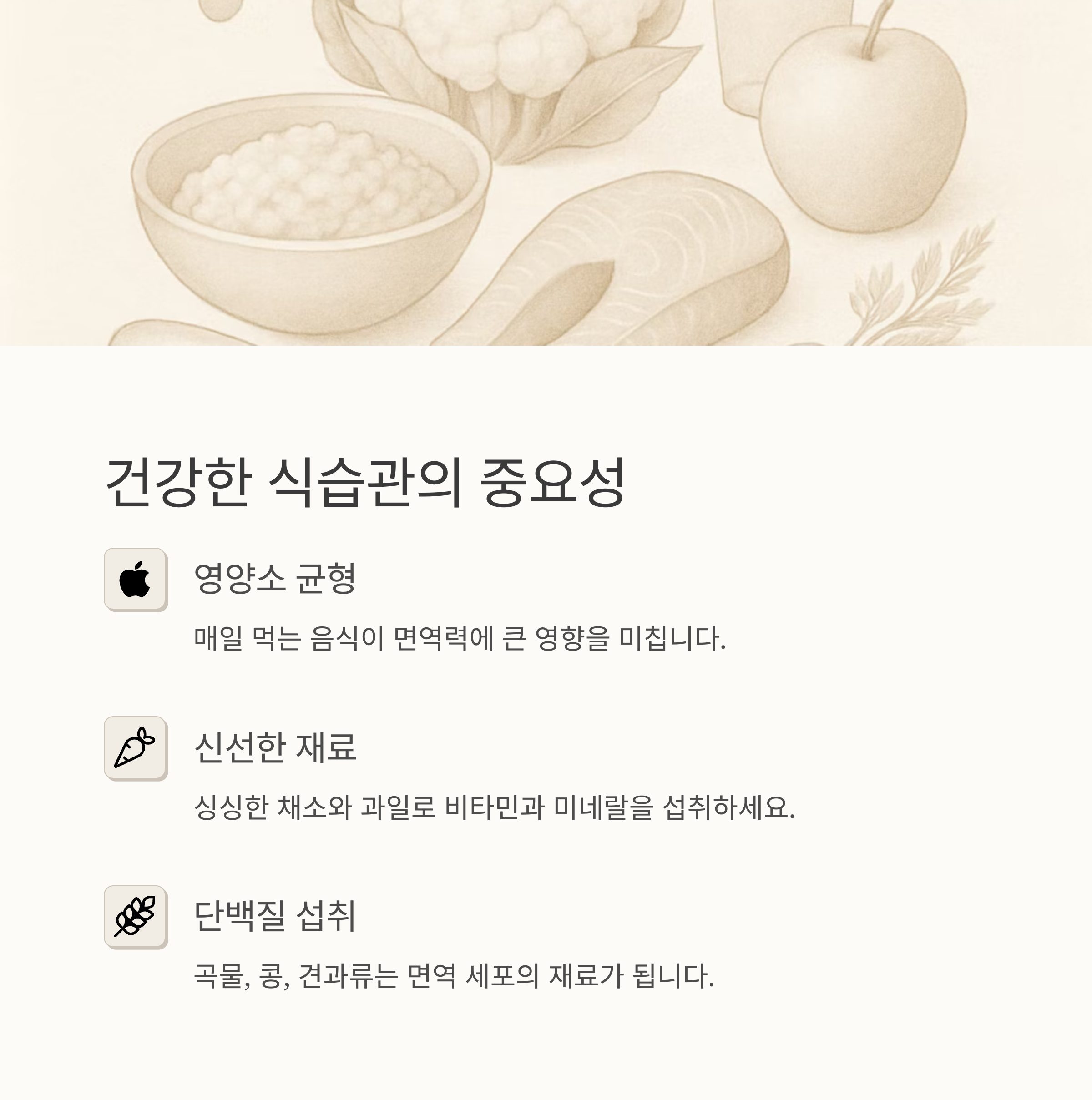 바로 우리가 매일 먹는 음식과 생활 습관이 핵심이랍니다. 이 글을 통해 건강한 식단과 생활 습관을 실천하며 면역력을 키우는 방법을 알아보고, 질병으로부터 건강을 지키는 똑똑한 관리법을 함께 배워봐요! 건강한 삶을 위한 여정에 함께해요!