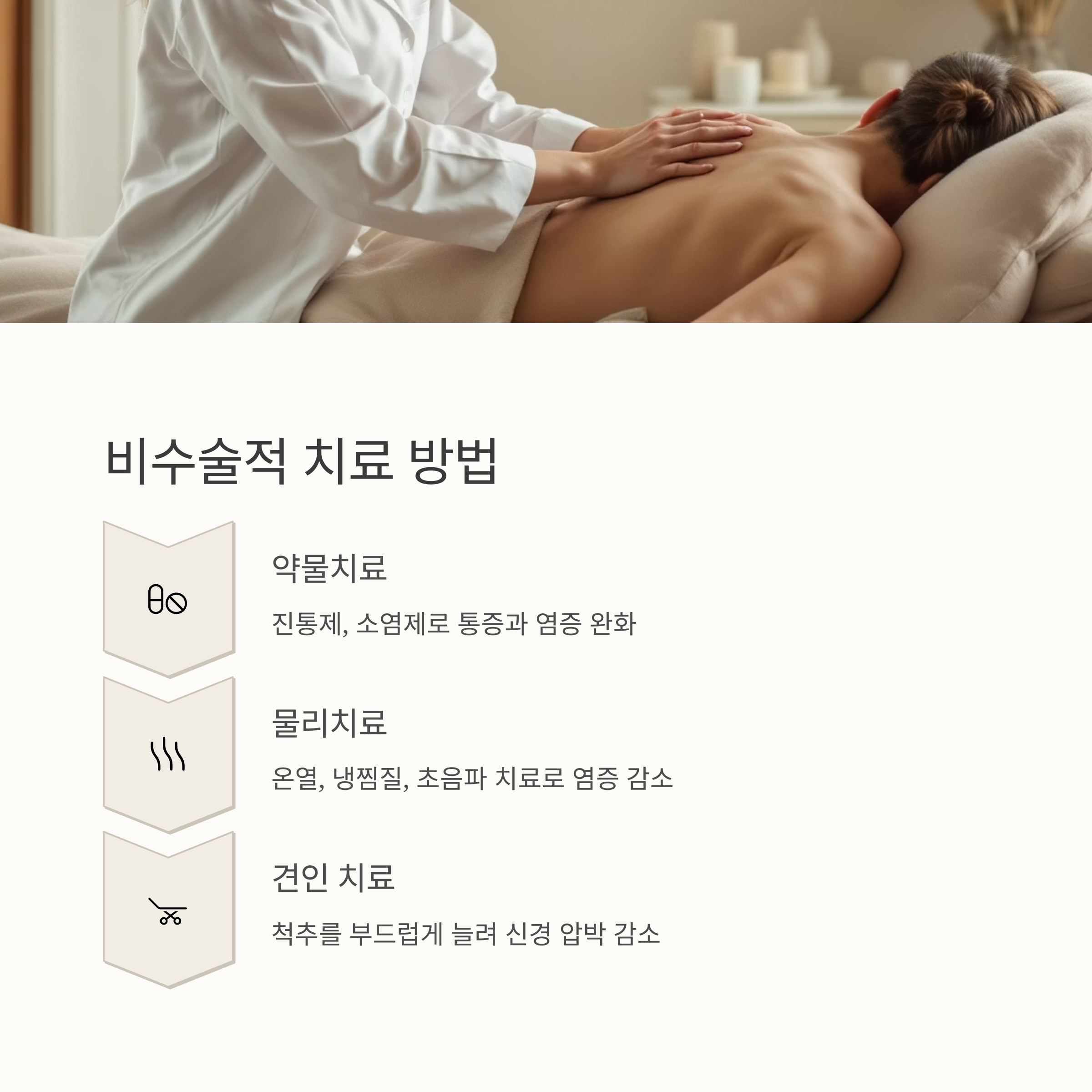 약물치료는 진통제나 소염제를 통해 통증과 염증을 완화시키는 방법입니다. 물리치료는 온열 치료, 냉찜질, 초음파 치료 등으로 염증을 줄이고 통증을 완화하는데 도움을 줍니다. 견인 치료는 척추를 부드럽게 늘려 신경 압박을 줄여주는 효과가 있고요.