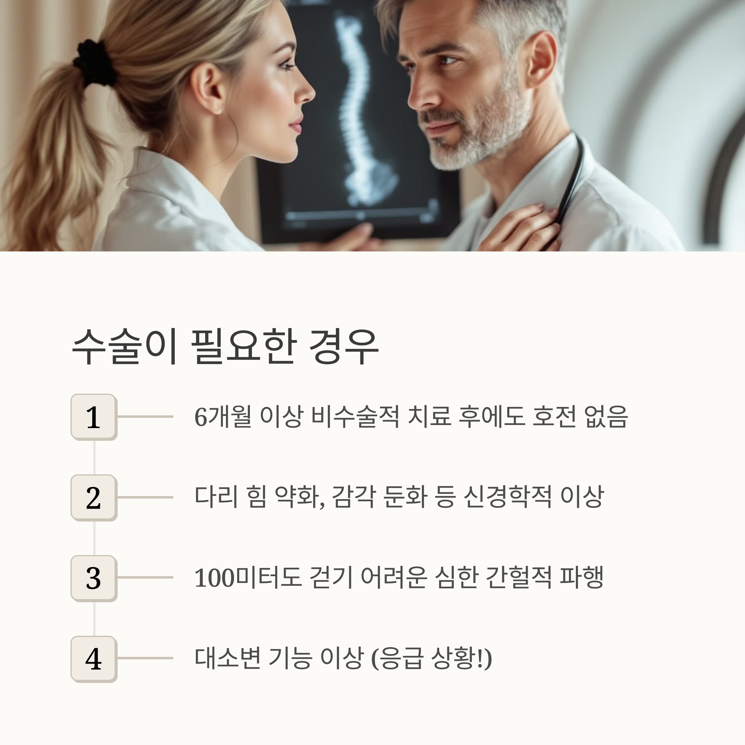 6개월 이상 비수술적 치료를 받았음에도 불구하고 증상이 호전되지 않거나 악화되는 경우, 다리의 힘이 약해지거나 감각이 둔해지는 등 신경학적 이상이 나타나는 경우, 100미터도 걷기 어려울 정도로 심한 간헐적 파행이 발생하는 경우 등이에요.