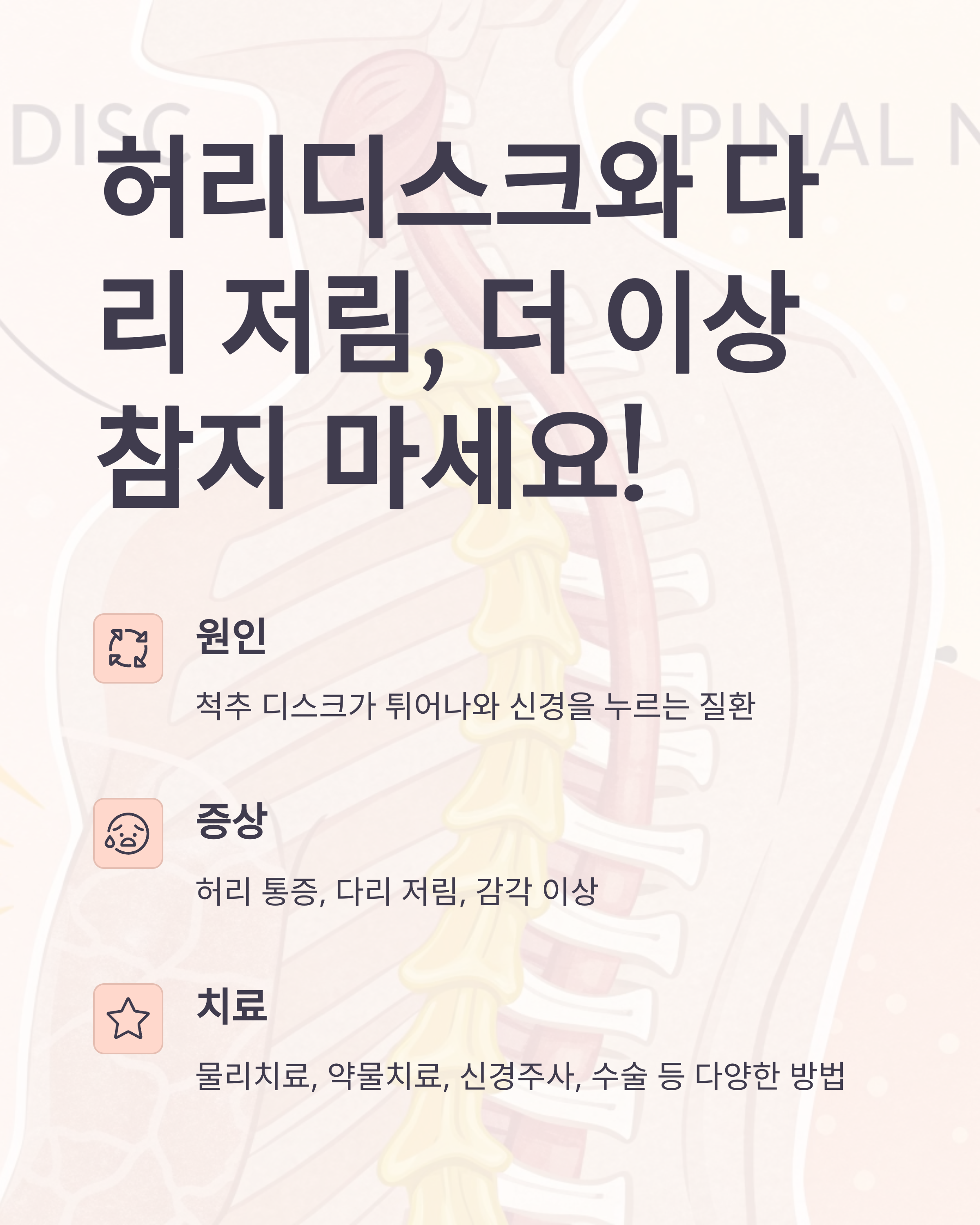 안녕하세요! 허리디스크 때문에 다리 저림까지 겪고 계신가요? 걷기 힘들고 일상생활까지 불편하게 만드는 허리디스크와 다리 저림 증상, 더 이상 참지 마세요! 이 글에서는 허리디스크의 원인부터 증상, 그리고 다양한 치료 방법까지 꼼꼼하게 알려드릴게요. 지금부터 저와 함께 허리 건강 되찾고 활기찬 일상을 만들어봐요!