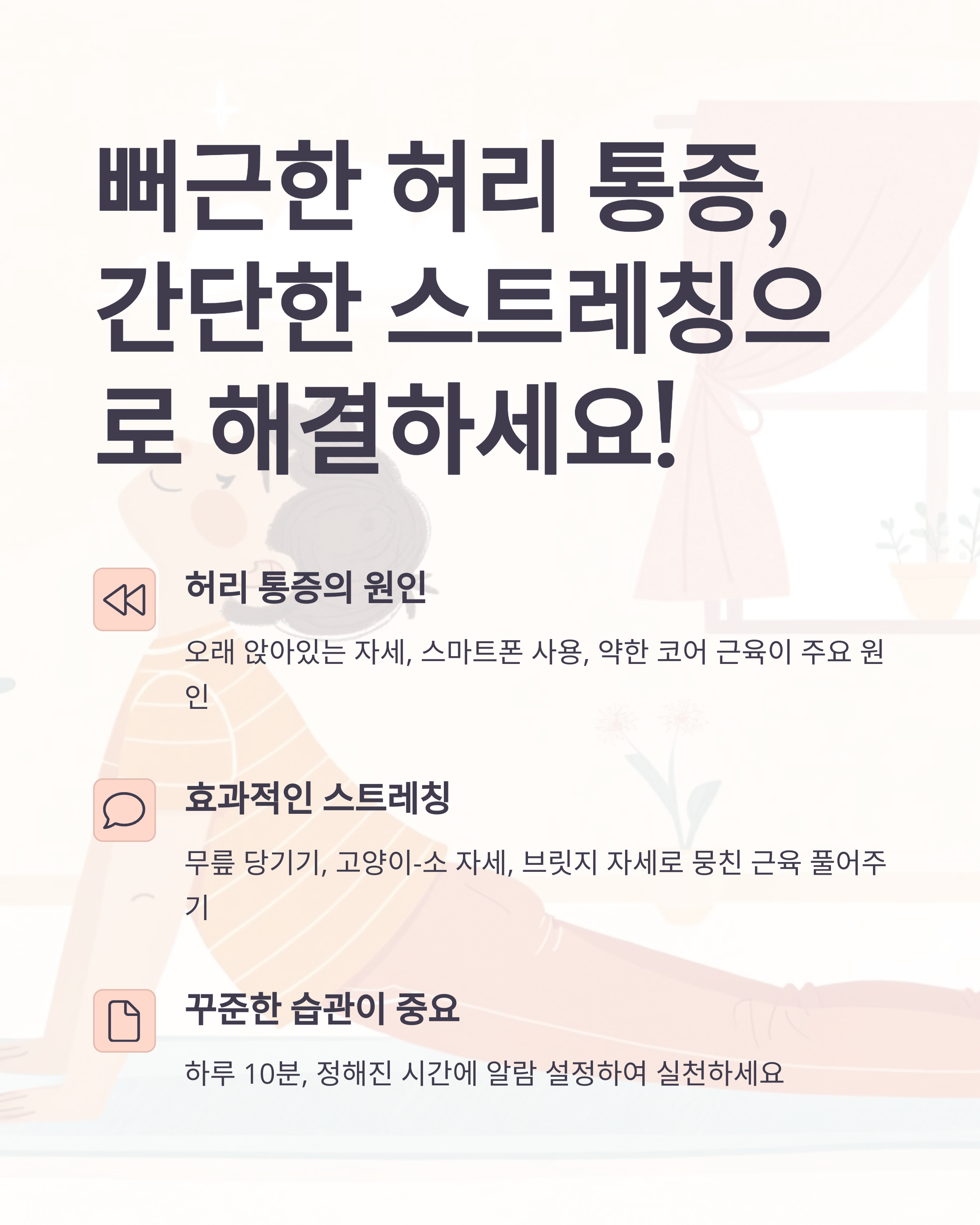 뻐근하고 불편한 허리, 이젠 참지 마세요! 간단한 스트레칭으로 통증 완화하고 건강한 허리 되찾는 방법을 알려드릴게요. 지금 바로 시작해서 가뿐한 일상을 만들어 보세요!