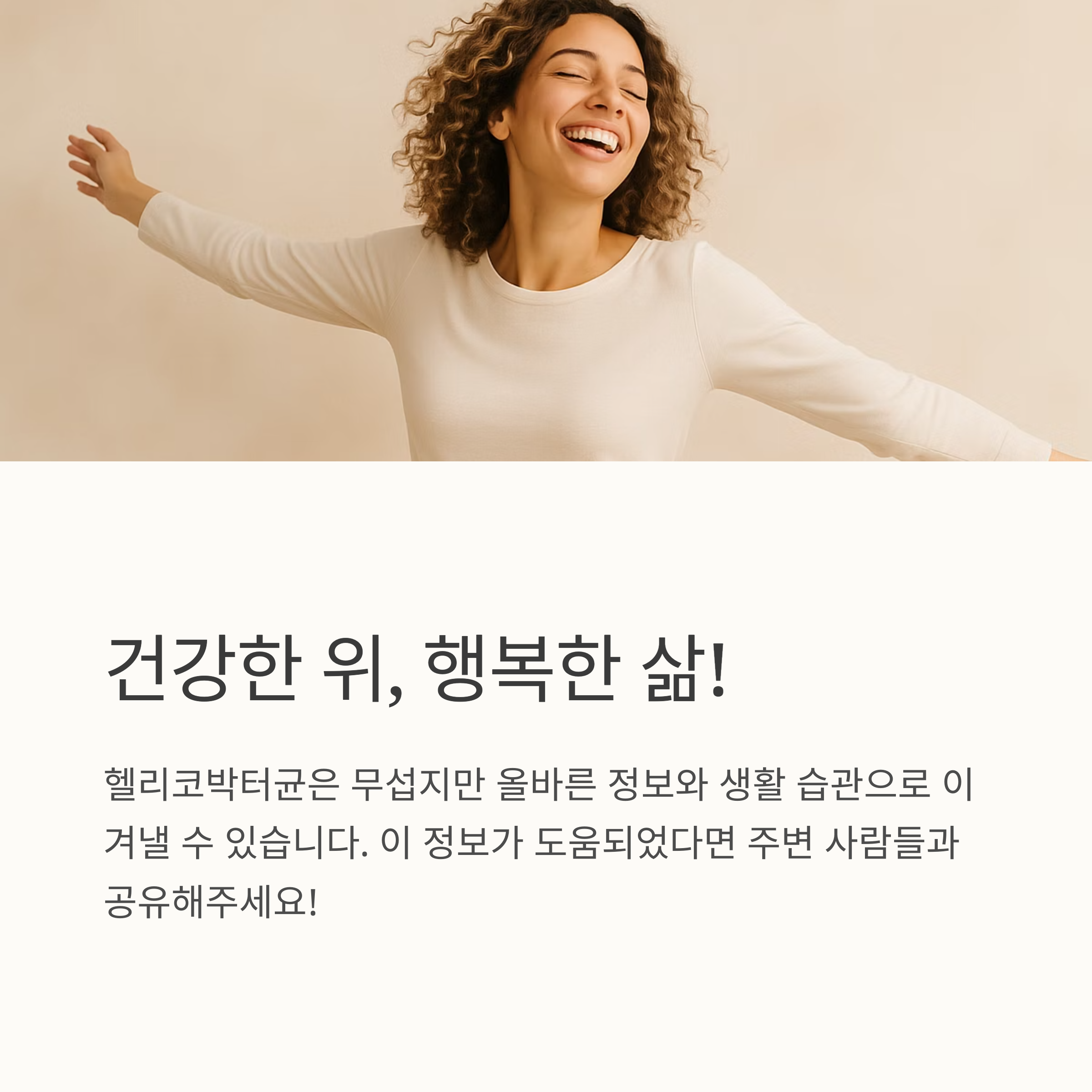 헬리코박터균은 무서운 존재지만, 정확한 정보와 건강한 생활 습관으로 충분히 이겨낼 수 있습니다. 오늘 알려드린 헬리코박터균에 좋은 음식을 잘 기억하시고, 건강한 위를 유지하며 행복한 삶을 누리시길 바랍니다. 건강한 위는 건강한 삶의 시작입니다! 그리고 잊지 마세요, 꾸준함이 최고의 무기입니다!