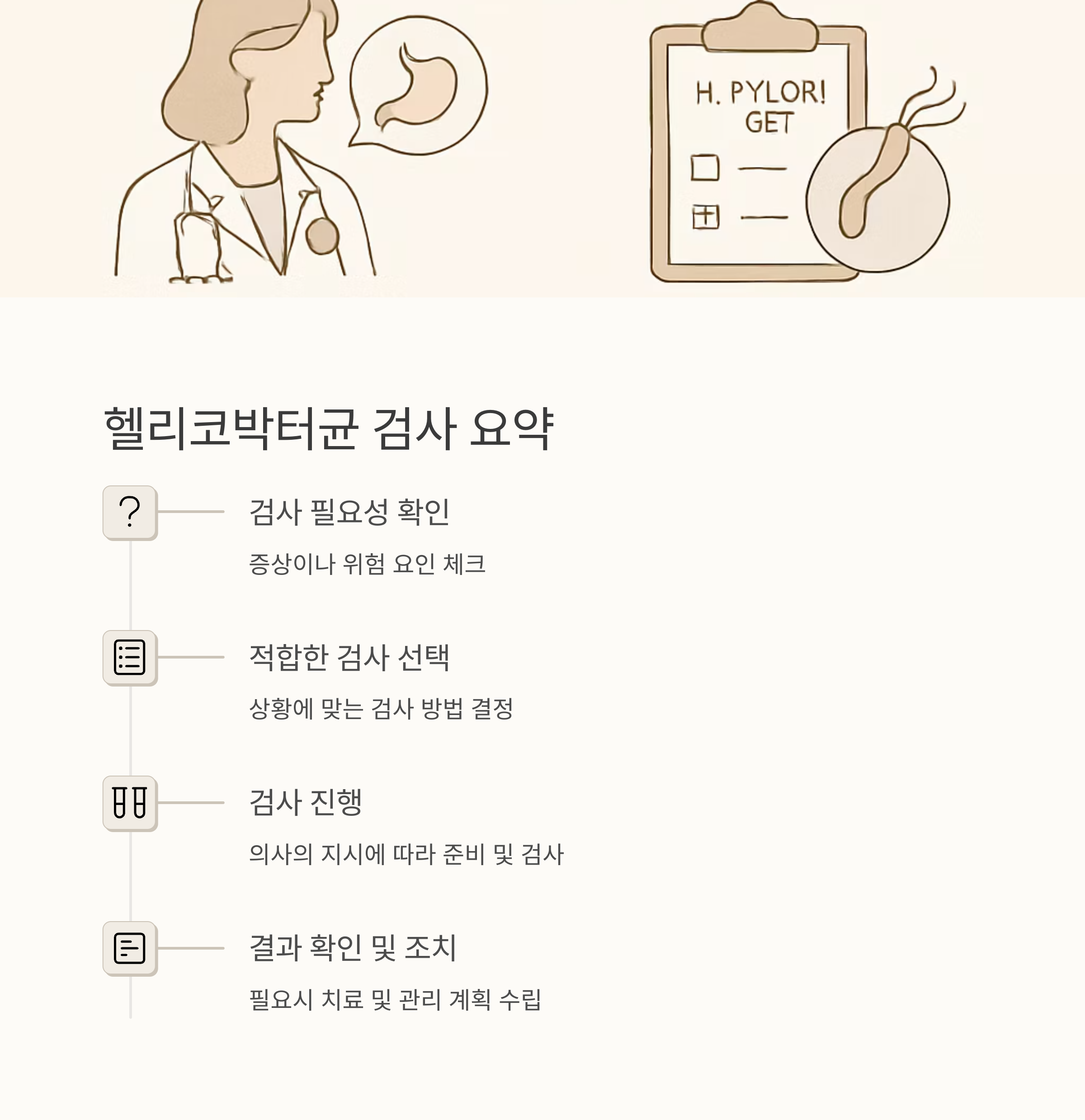 검사는 크게 혈액검사, 호기검사, 그리고 조직검사(내시경) 세 가지로 나뉘어요. 각각의 검사 방법과 장단점을 비교해 보면서, 어떤 검사가 나에게 가장 적합한지 판단해 볼 수 있겠죠.