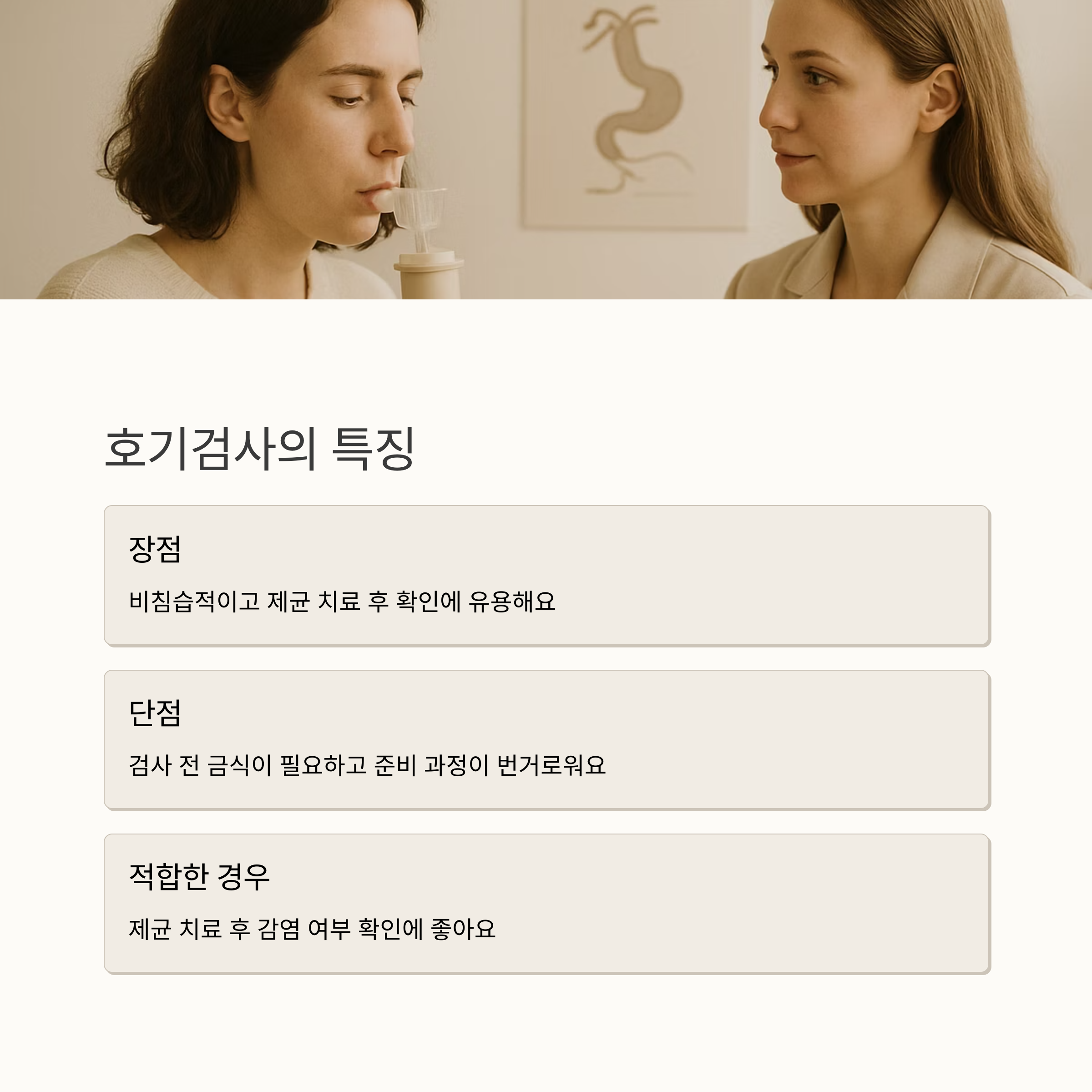 호기검사는 요소라는 물질을 마신 후 숨을 내쉬는 검사에요. 숨에 포함된 특정 기체를 측정하여 헬리코박터균 감염 여부를 확인하는 방식인데요. 비침습적이고 제균 치료 후 감염 여부 확인에 유용해요. 하지만 검사 전 금식이 필요하고, 검사 준비 과정이 조금 번거로울 수 있어요. 특히 제균 치료 후 감염이 완전히 사라졌는지 확인할 때 유용하답니다.